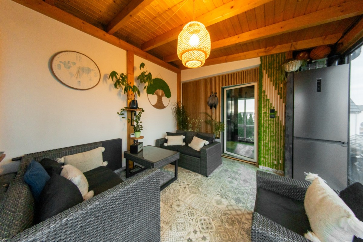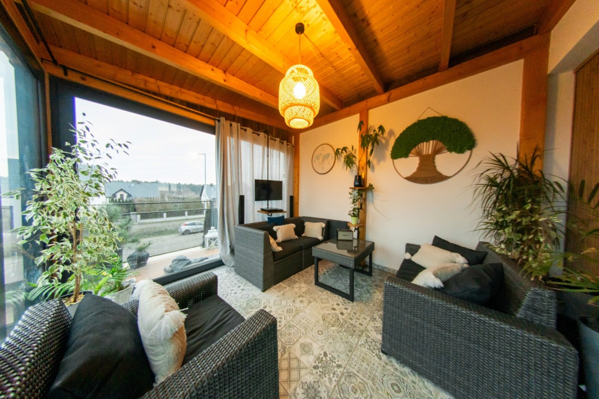 Zadaszony taras w formie ogrodu zimowego to jeden z najmocniejszych atutów tej nieruchomości.