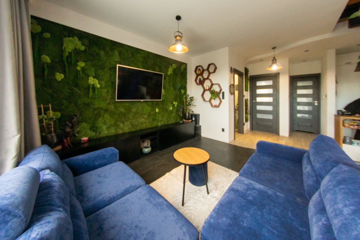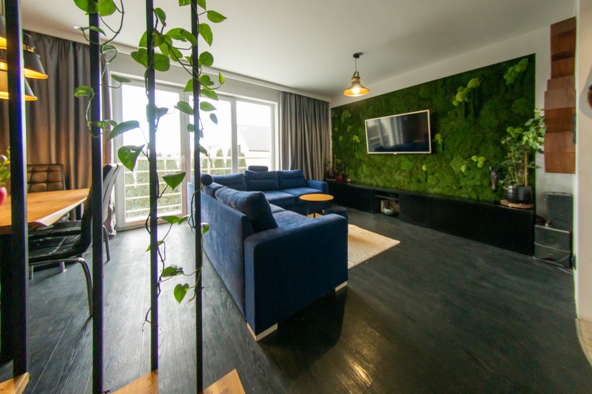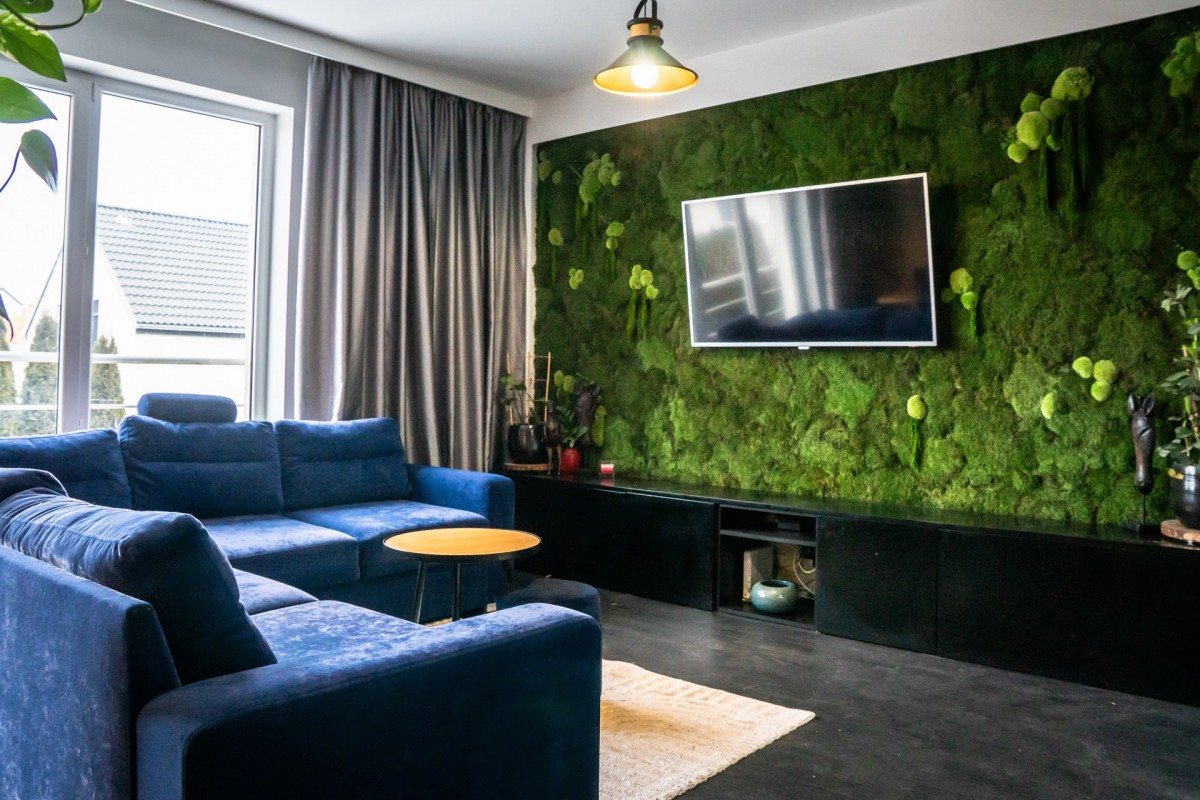 Pełne, efektowne przeszklenia zapewniają doskonałe doświetlenie wnętrza przez cały dzień. Centralnym elementem salonu jest ściana z żywego mchu — designerski detal, który podnosi reprezentacyjność wnętrza i nadaje mu wyjątkowy charakter.