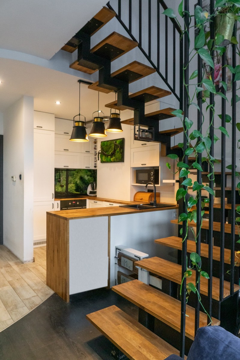 Do mieszkania wchodzimy przez klatkę schodową prowadzącą do funkcjonalnego przedsionka z miejscem na odzież wierzchnią i obuwie. To przestrzeń przejściowa, która łączy część mieszkalną z ogrodem zimowym — rozwiązanie niezwykle praktyczne w codziennym użytkowaniu.