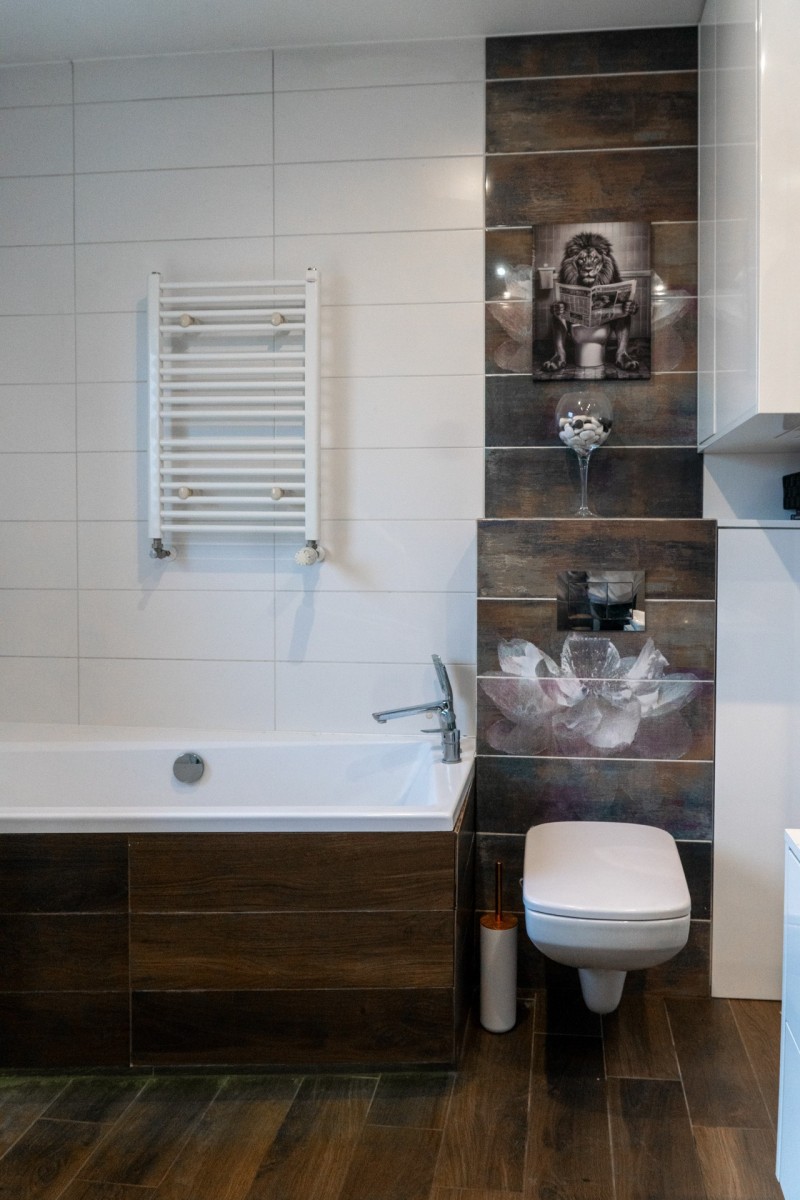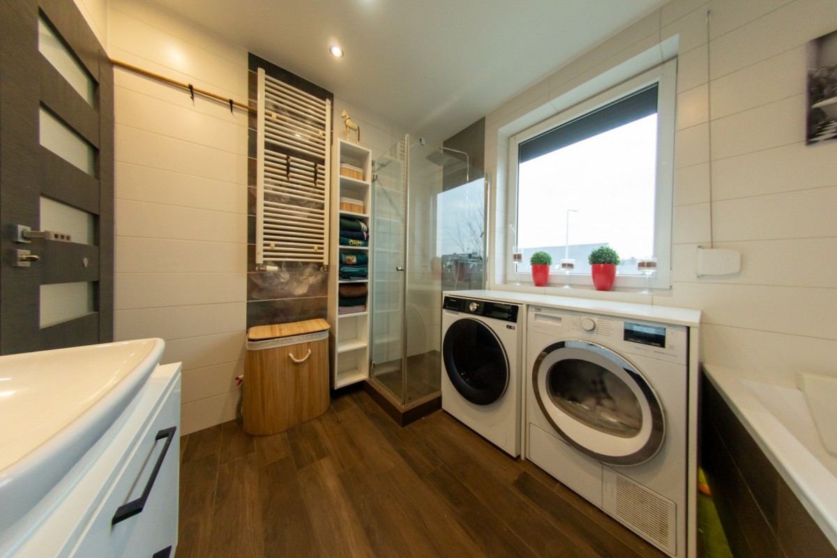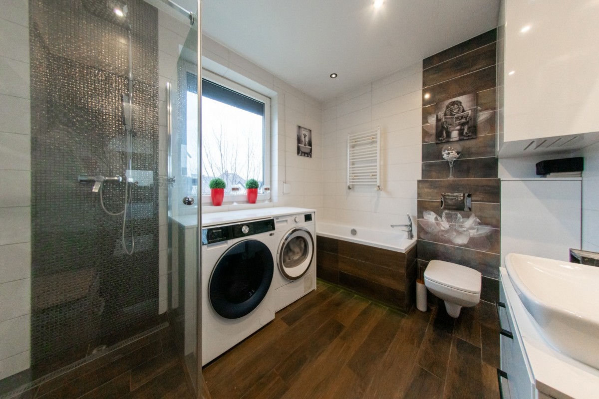 • przestronna łazienka wyposażona w wannę i prysznic, zabudowana toaleta GEBERIT, miejsce na pralkę i suszarkę.