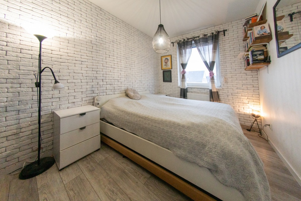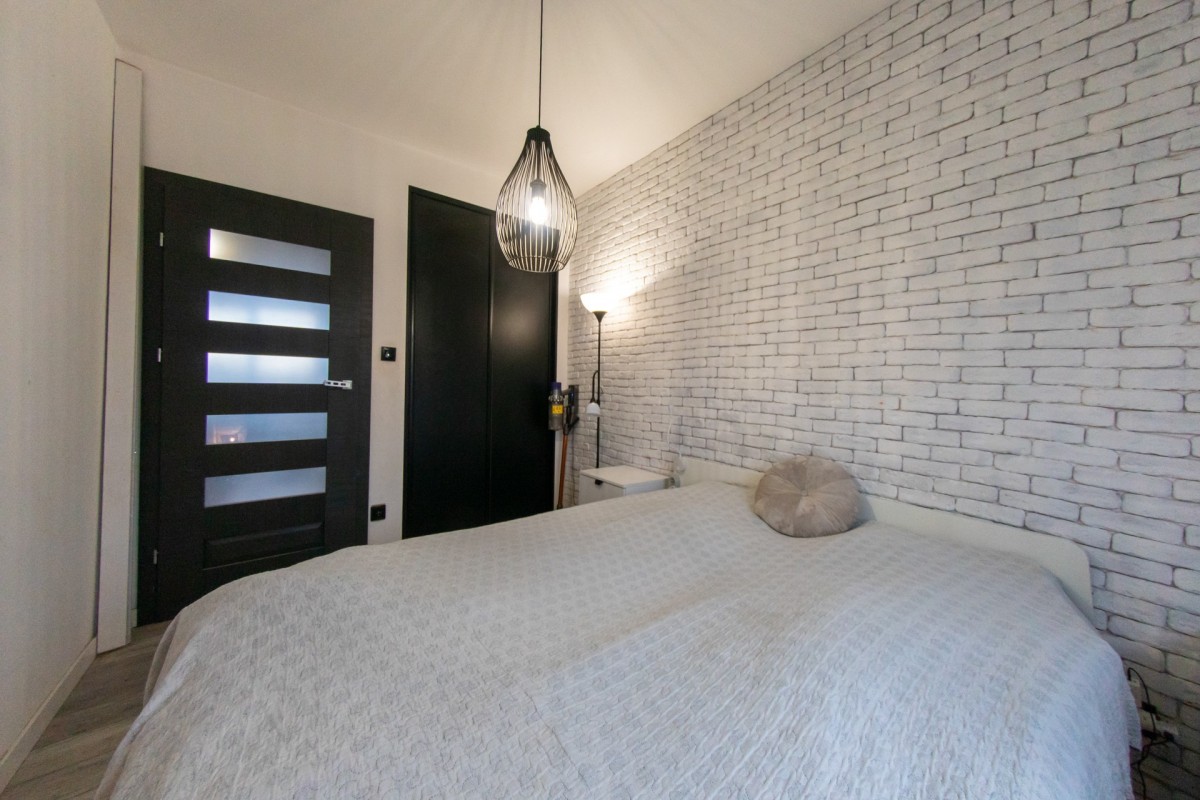 Pierwsza sypialnia — mniejsza, ustawna — idealna jako pokój dziecka, gabinet lub pokój gościnny.
