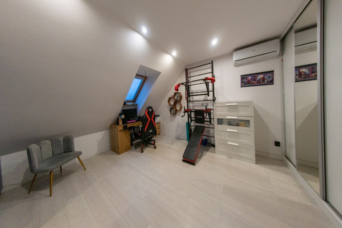- łóżko, biurko, profesjonalna toaletka, duża szafa i strefa garderobiana.