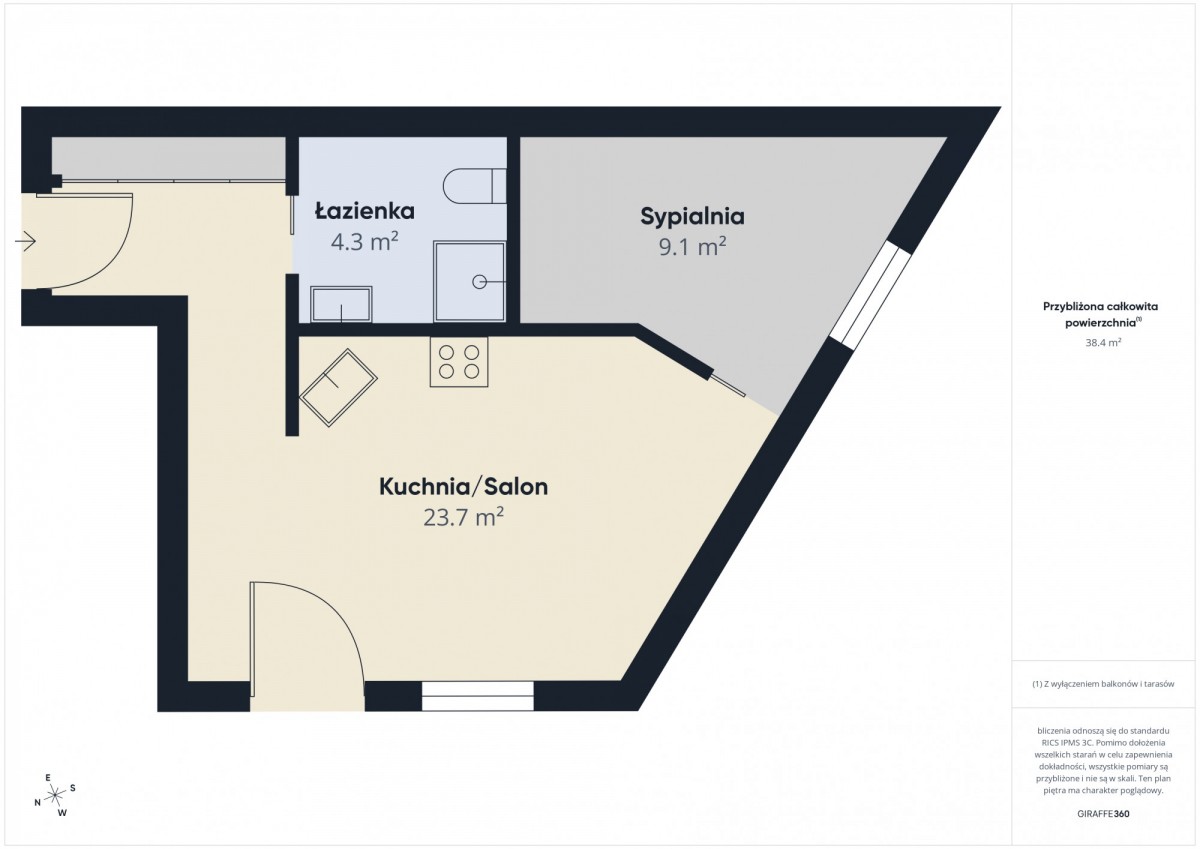 Powierzchnia tego parterowego mieszkania wynosi 36,82 m2 i składa się z: