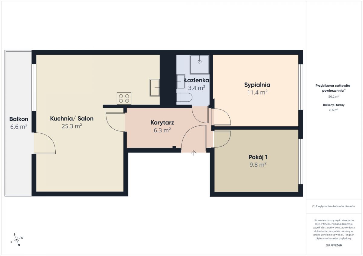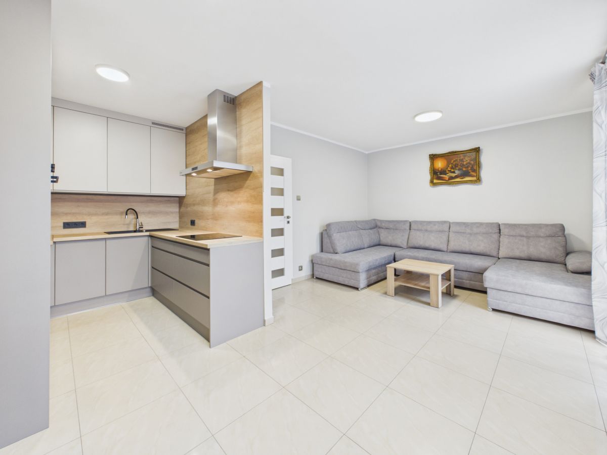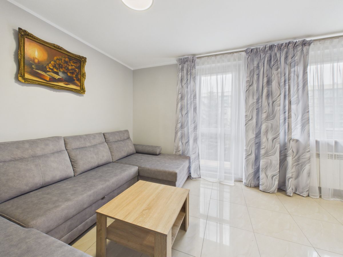 - przestronny salon z aneksem kuchennym — nowoczesna, otwarta strefa dzienna z wyjściem na balkon;