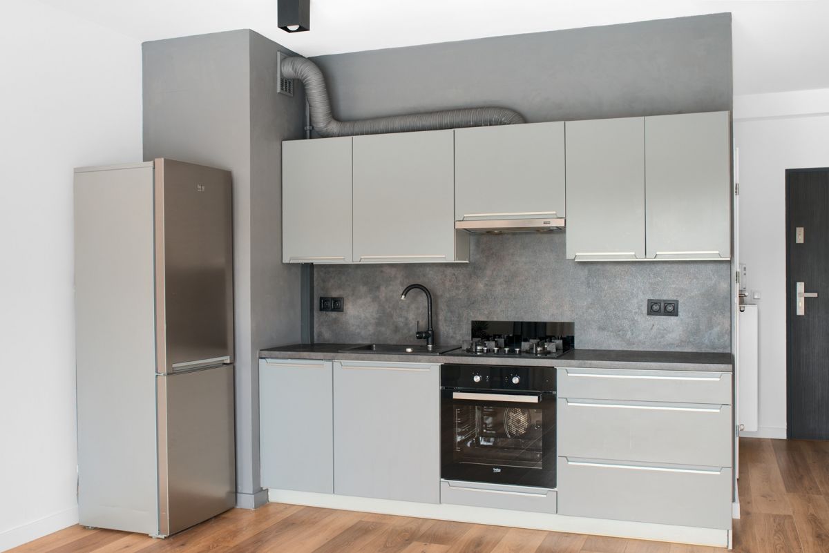 Kuchnia wyposażona jest w sprzęty AGD: piekarnik, płyta gazowa, okap, zmywarka i lodówka.