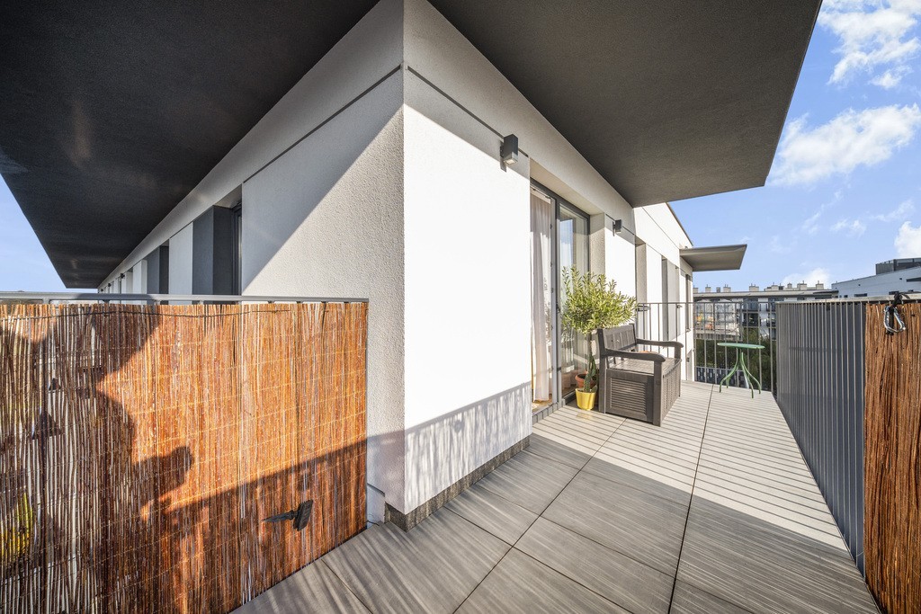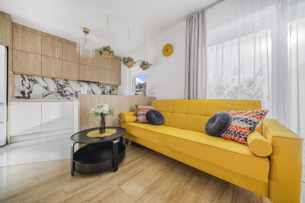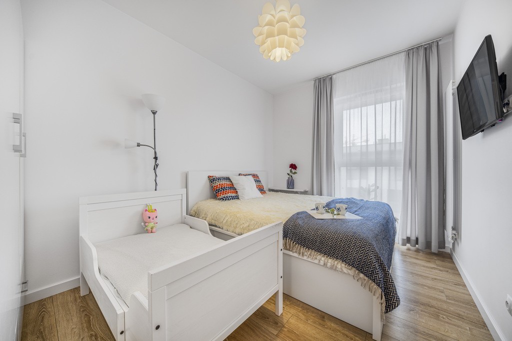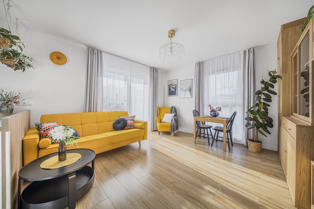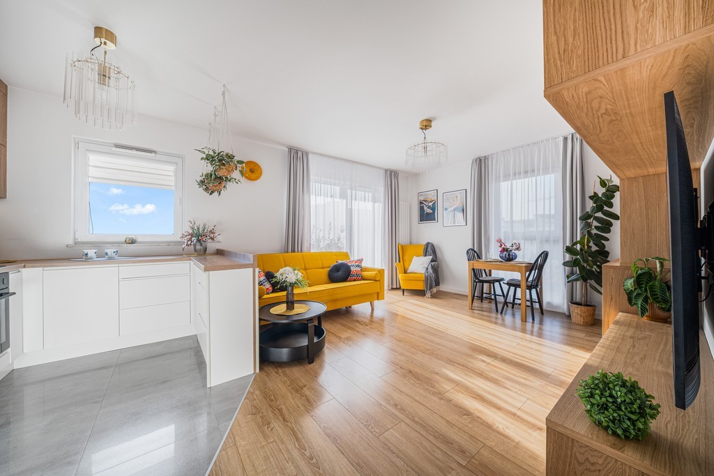 Salon z aneksem kuchennym usytuowany jest od strony południowej, natomiast dwie sypialnie mają okna wychodzące na zachód, dzięki czemu są jasne i przytulne. Duże przeszklenia sprawiają, że całe mieszkanie jest wyjątkowo widne i dobrze doświetlone.