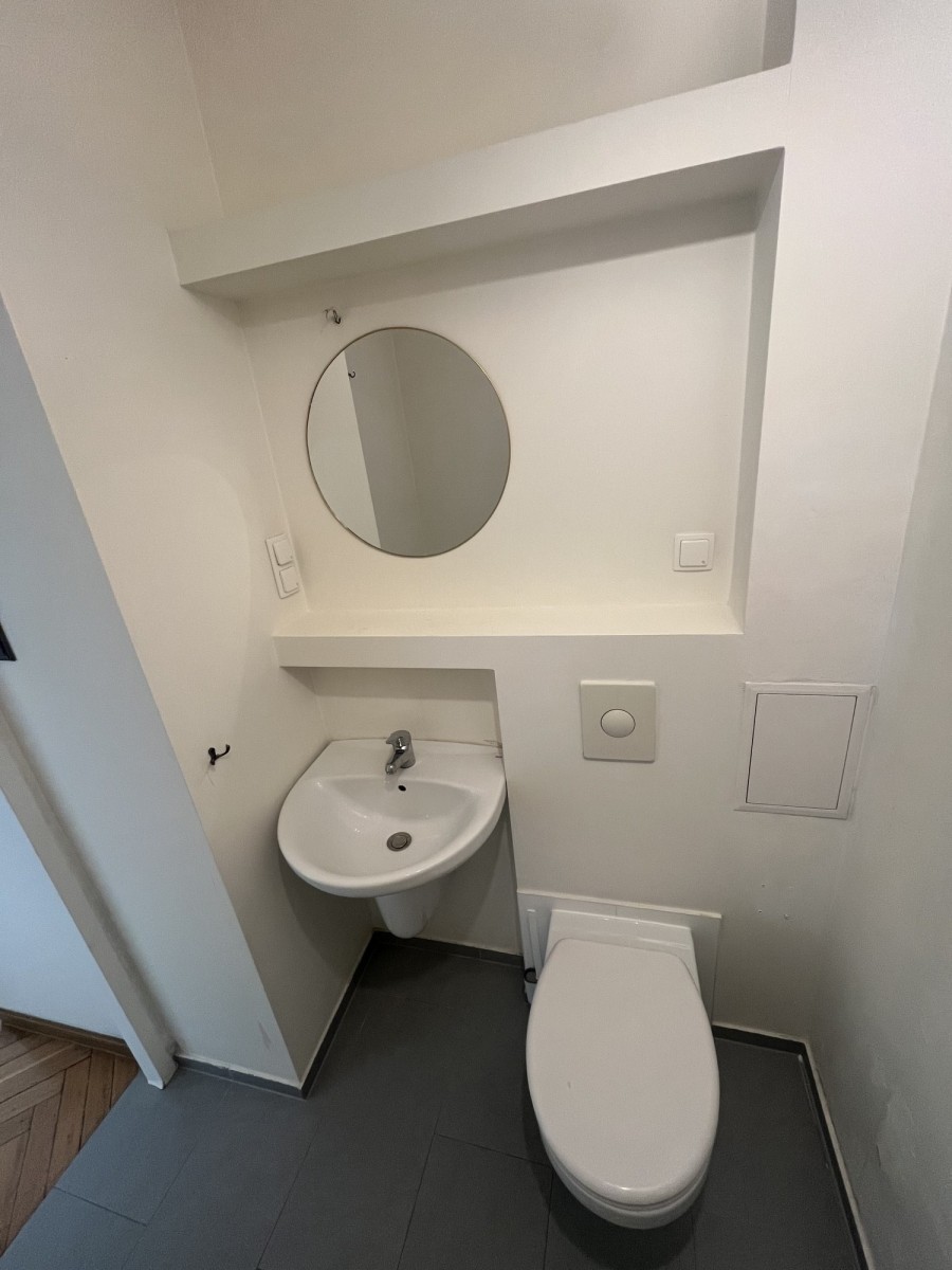 Udało się tu znaleźć miejsce na sprytną szafę wnękową lub spiżarkę, która bez problemu pomieści pralkę - dzięki temu nie musisz jej trzymać w łazience.