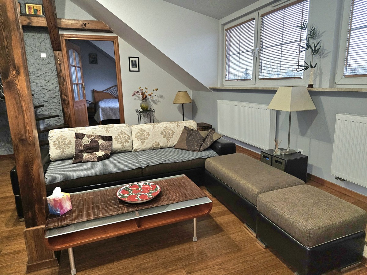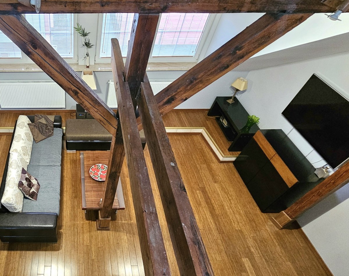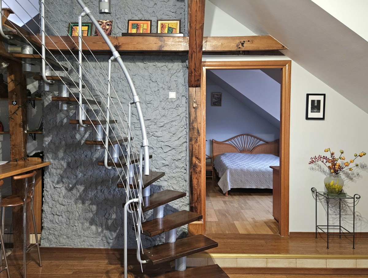 Dwupoziomowy apartament o powierzchni całkowitej 125 m² (95 m² w KW + 30 m² solidnej antresoli), powstały w wyniku kompleksowej adaptacji poddasza w 2007 roku.