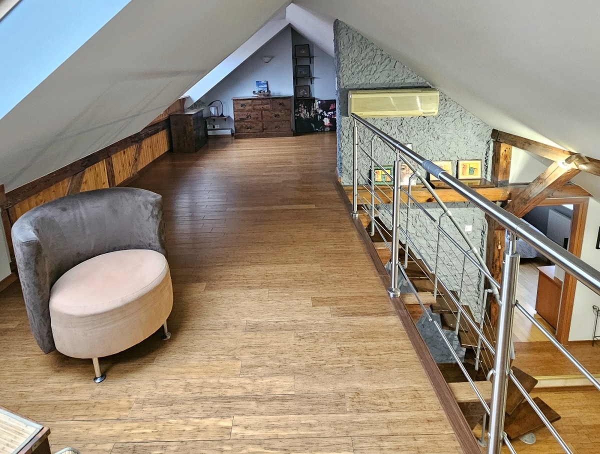 II Poziom (Antresola 30 m²): Solidna konstrukcja obecnie pełniąca funkcję gabinetu i miejsca wypoczynkowego, z możliwością wykorzystania jako dodatkowa sypialnia.