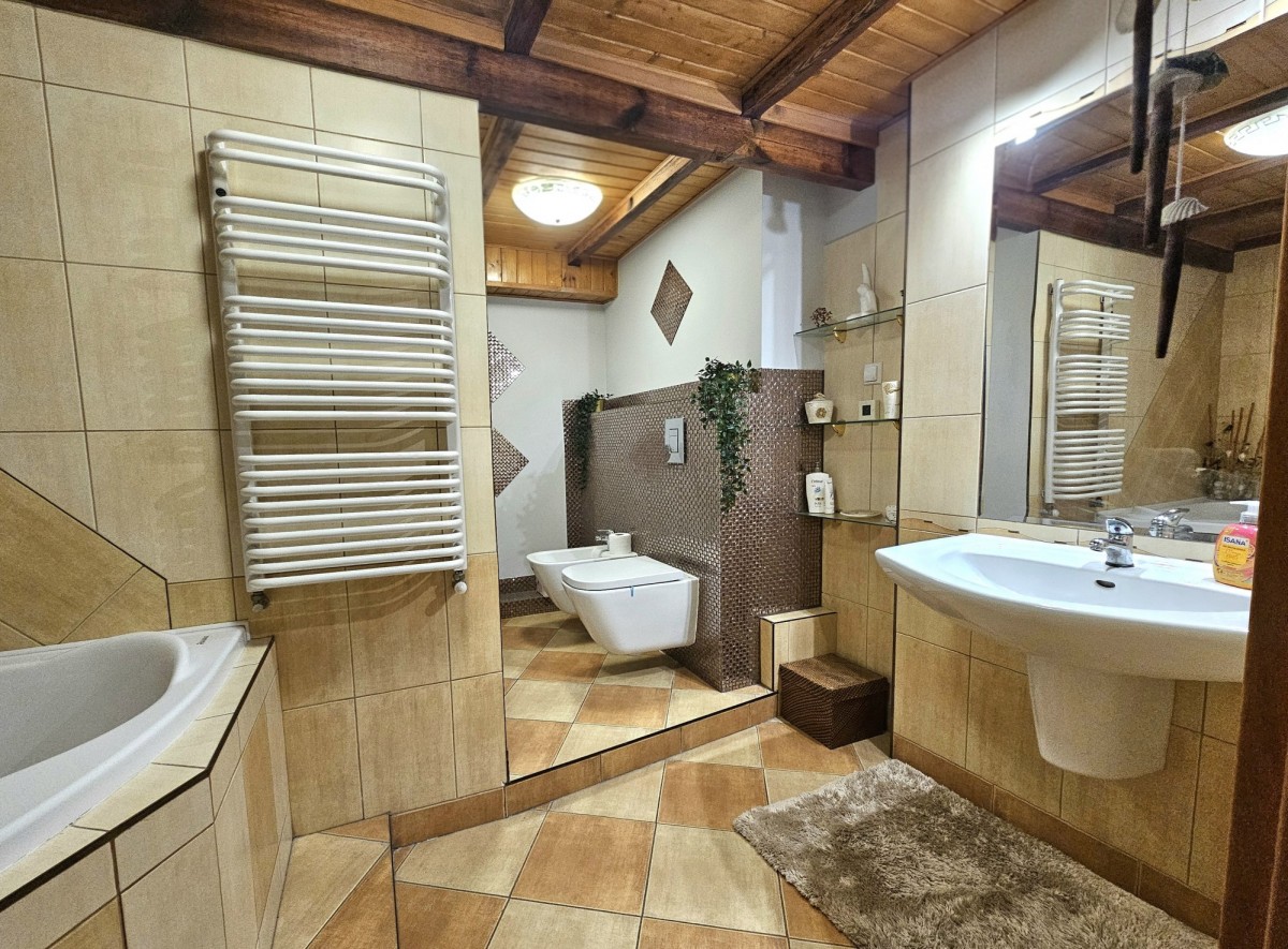 I Poziom (95 m²): Przestronny salon + hall (50 m²) z kominkiem, aneks kuchenny (5 m²), sypialnia (9 m²), główna sypialnia (10 m²) z prywatną łazienką (8 m², wanna i WC), druga łazienka z prysznicem (3 m²) oraz schowek (3 m²).