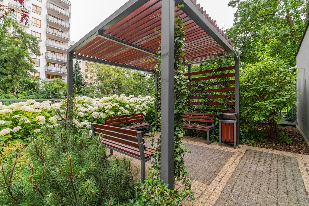 altanka z ławkami otoczona bujną zielenią. Dla miłośników rowerów przygotowano również