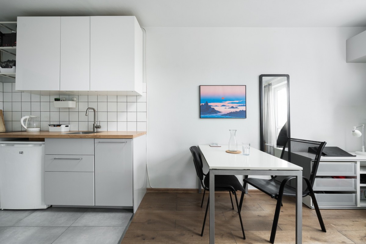 • przedpokój połączony z aneksem kuchennym i pokojem