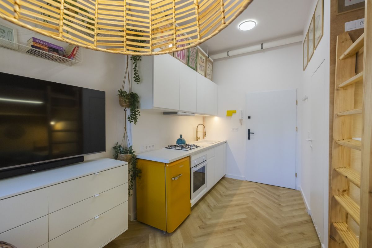 Mieszkanie po generalnym remoncie z wykorzystaniem przemyślanych rozwiązań optymalizujących przestrzeń. Kawalerka znajduje się na 4 piętrze z 5 w budynku bez windy.