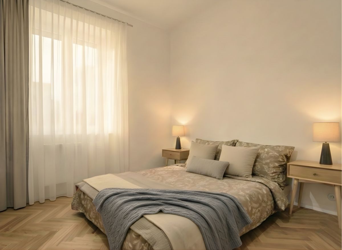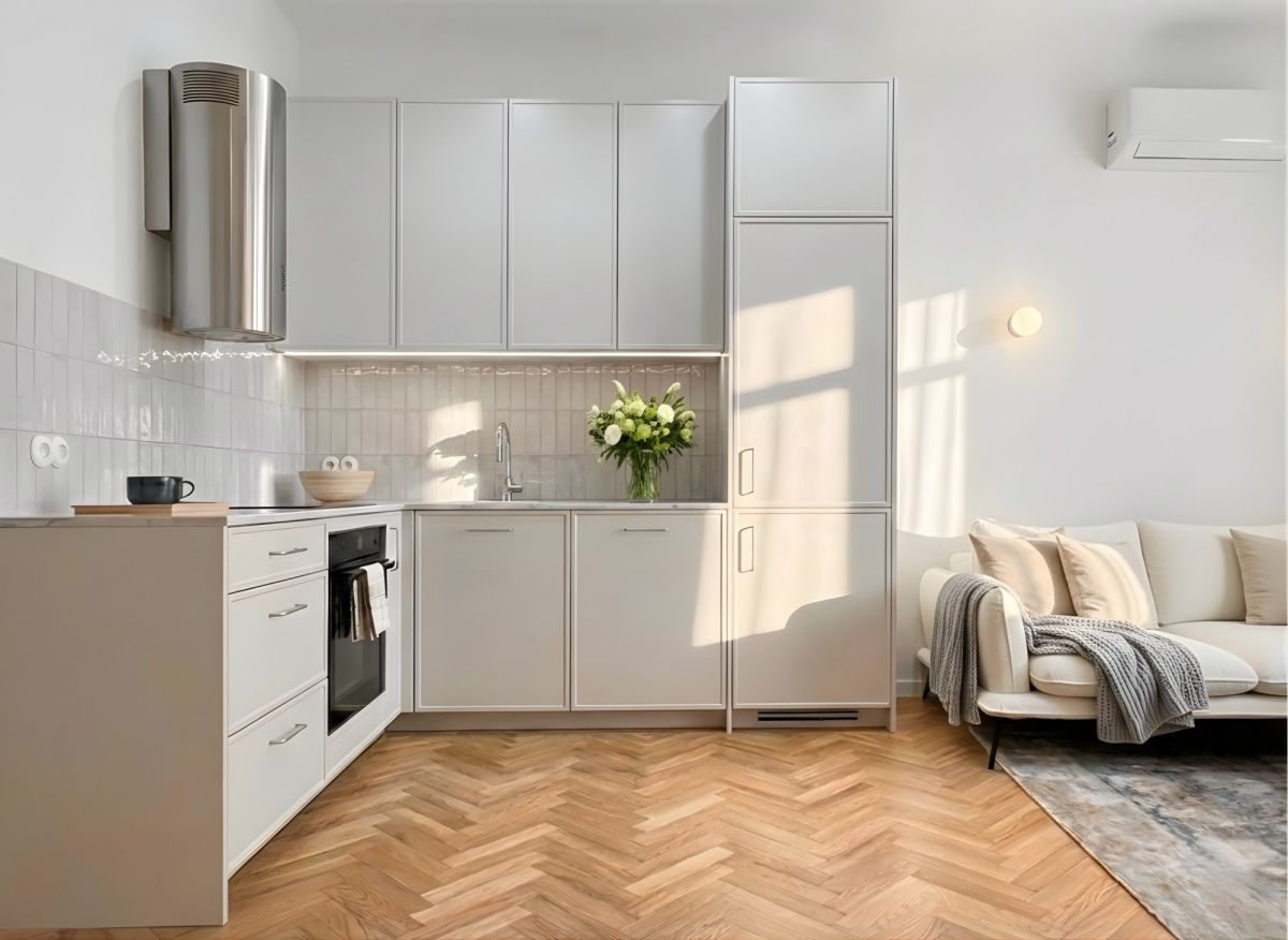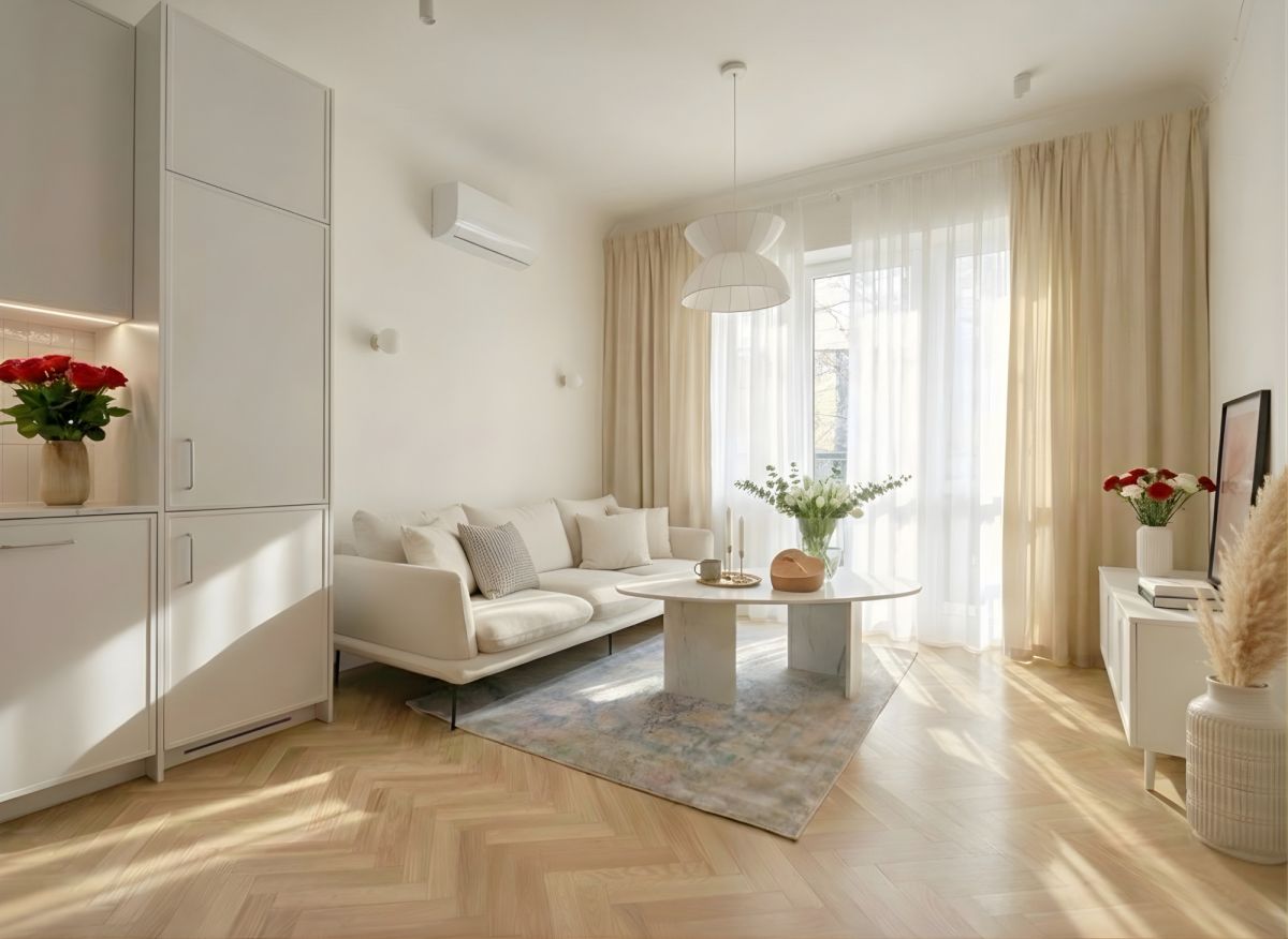 Całość utrzymana jest w ciepłej, jasnej kolorystyce z naturalnymi akcentami. Dębowy parkiet ułożony w klasyczną jodełkę podkreśla ponadczasowy charakter wnętrza i wprowadza elegancję, która nie wychodzi z mody. Spójna paleta barw oraz starannie dobrane materiały tworzą atmosferę spokoju i harmonii.