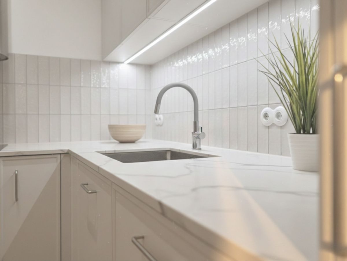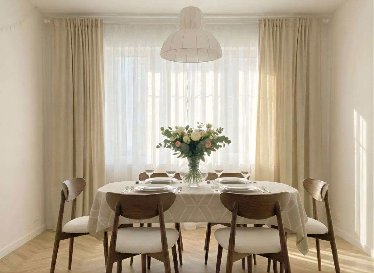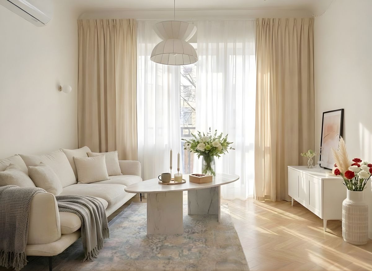 Całość utrzymana jest w ciepłej, jasnej kolorystyce z naturalnymi akcentami. Dębowy parkiet ułożony w klasyczną jodełkę podkreśla ponadczasowy charakter wnętrza i wprowadza elegancję, która nie wychodzi z mody. Spójna paleta barw oraz starannie dobrane materiały tworzą atmosferę spokoju i harmonii.