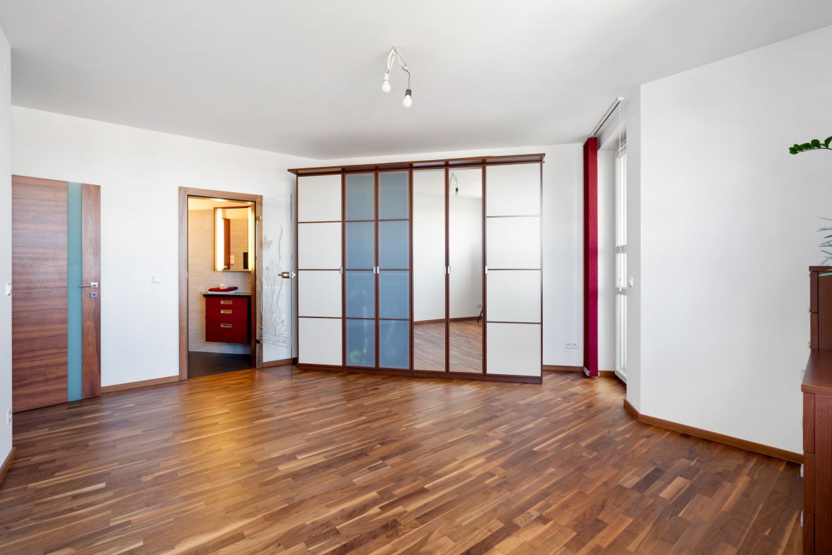 - Sypialnia główna z zabudowaną loggią i prywatną łazienką z prysznicem