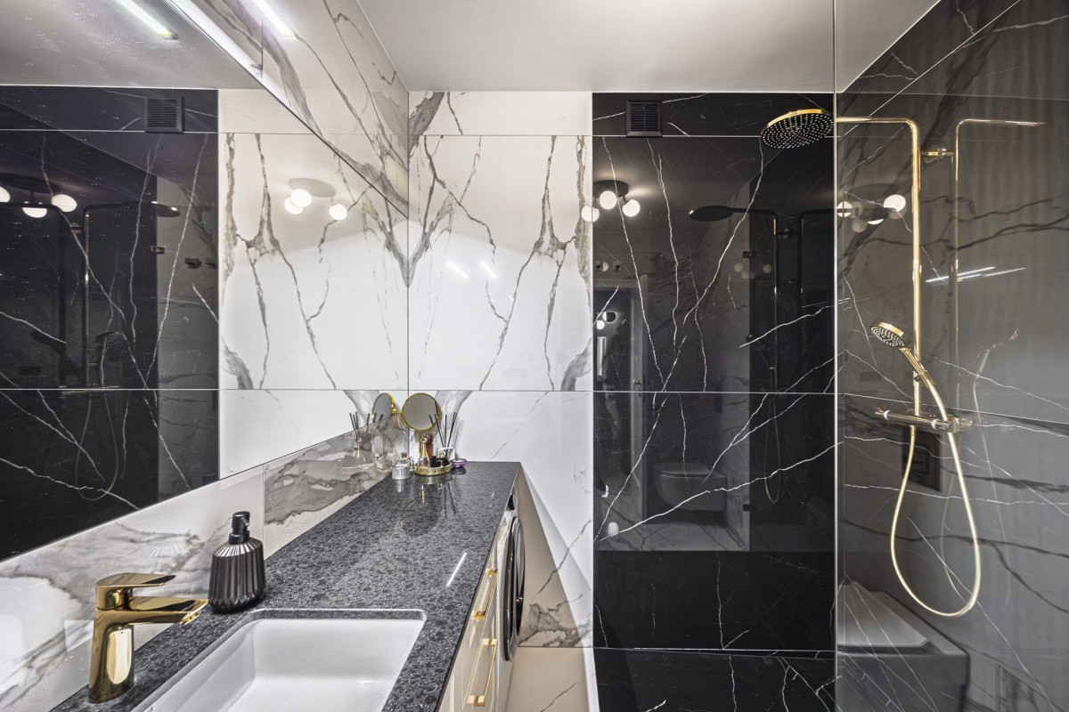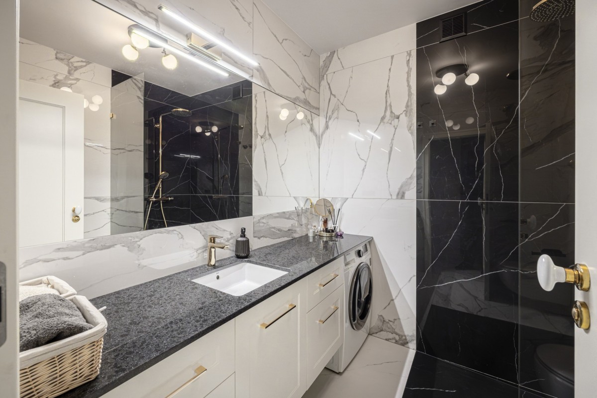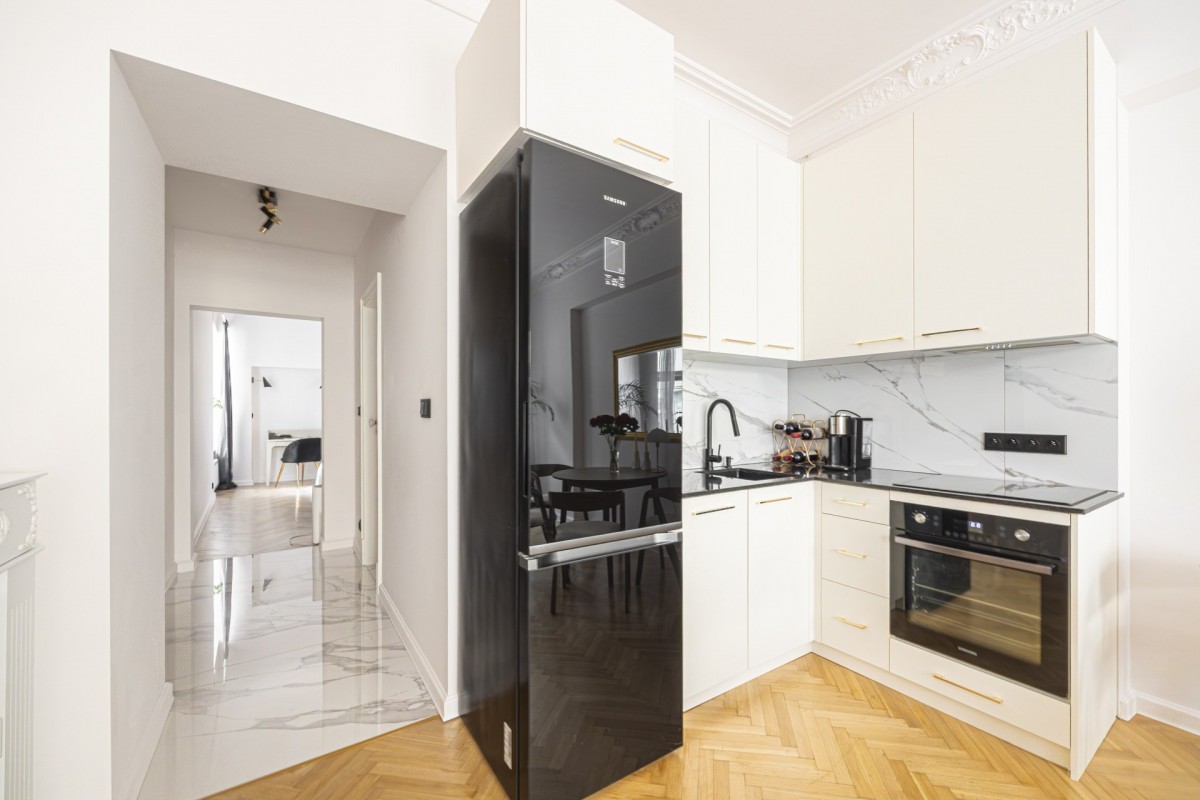 Wykończenie w ponadczasowej elegancji, wysokość pomieszczeń ok. 3,10 m. Kuchnia na zamówienie (konglomerat kwarcowy, złote akcenty), pełne AGD Samsung (Dual Cook, Dual Flex Zone, No Frost). Armatura Hansgrohe i Grohe, zabudowy stolarskie na wymiar, odrestaurowane sztukaterie, nowe drzwi wejściowe i instalacja elektryczna. Przygotowanie pod kino domowe: okablowanie, elektryczny ekran, Dolby Atmos. Ogrzewanie miejskie + podłogowe w strefach.