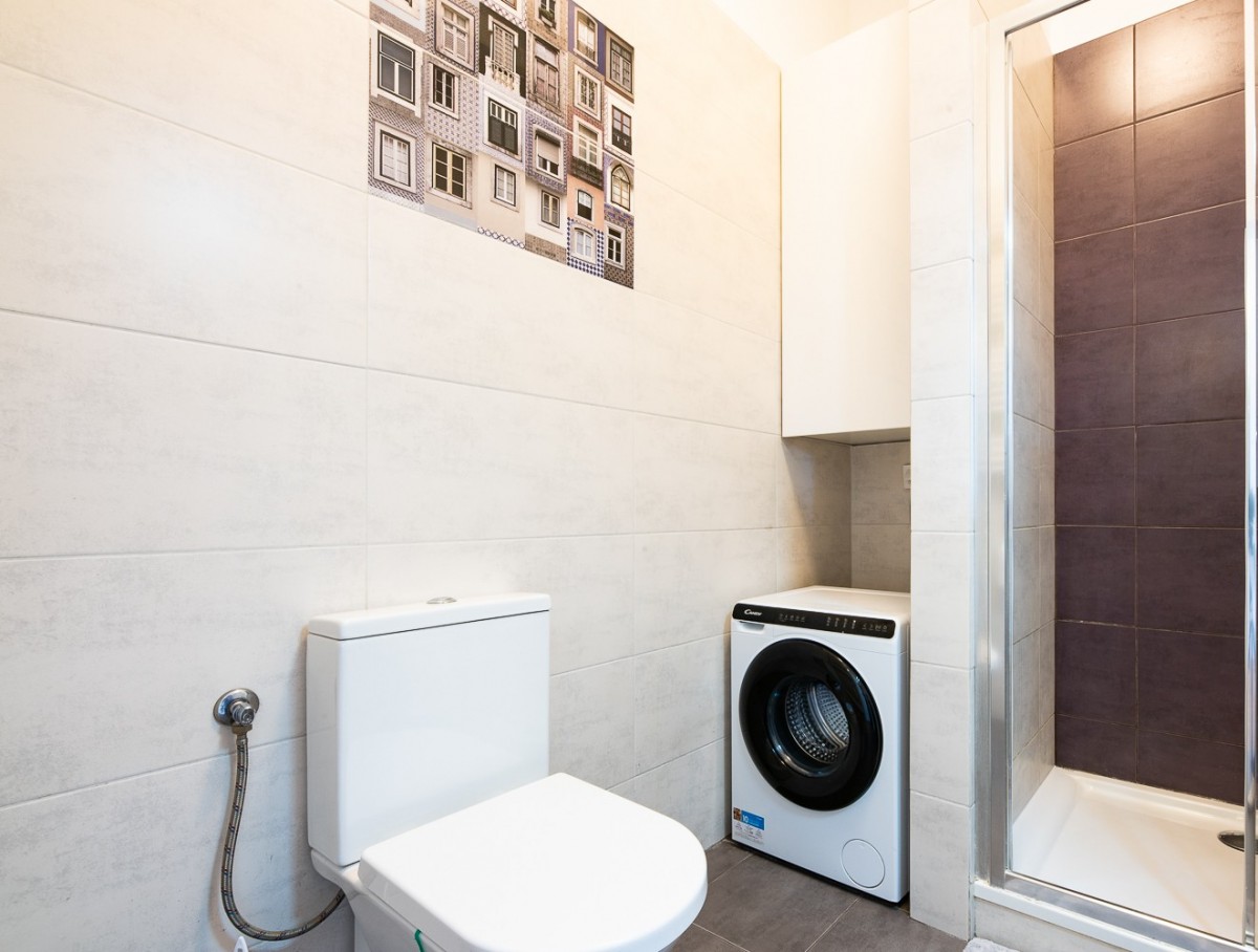 W łazience kabina prysznicowa, pralka, szafki i półki, naprawdę jest tu dużo miejsca.