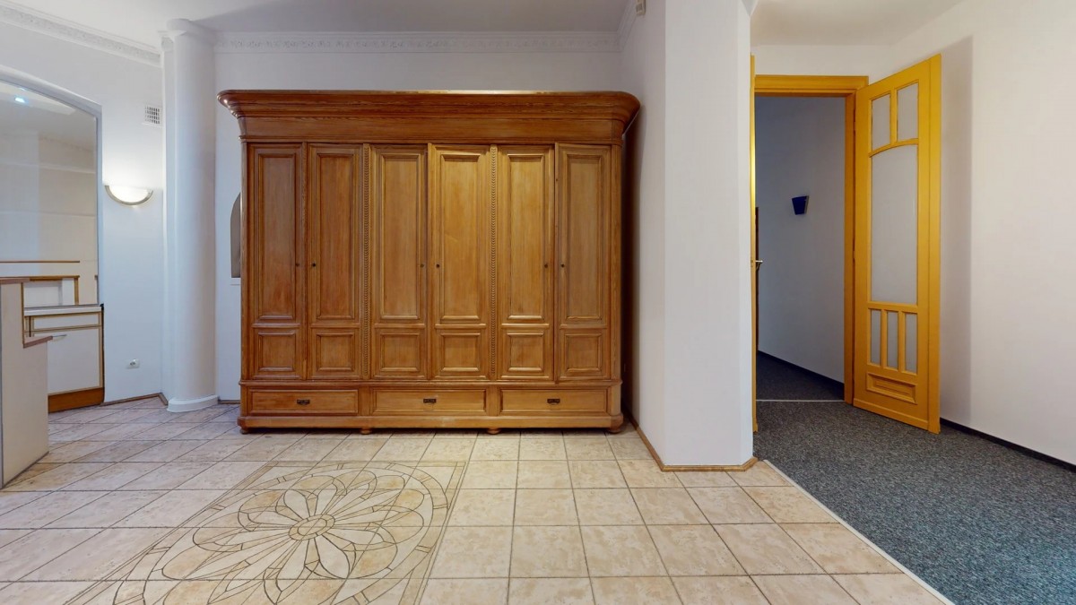 - Obecnie mieszkanie podzielone jest na 5 pokoi o różnej wielkości, z których największy ma 3 okna i wyjście na balkon.