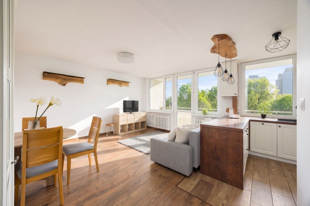 Salon połączony z nowoczesnym aneksem kuchennym tworzy przestronne centrum domu. Półwysep kuchenny nie tylko optycznie oddziela strefę gotowania, ale też stanowi dodatkowy blat roboczy i miejsce do spożywania posiłków, co pozwala zaoszczędzić miejsce w części wypoczynkowej. Szeroki widok na zielony skwer to duży plus tego lokalu. Z salonu jest wyjście na balkon (6m2).