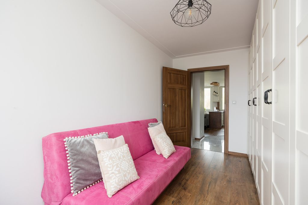 Dwie oddzielne sypialnie dają domownikom pełną swobodę. Jedna z nich posiada duże łóżko z dodatkowym schowkiem, a druga bardzo pojemną garderobę i może również służyć jako biuro do pracy zdalnej bądź nauki. Dodatkowo, rozdzielenie łazienki i WC to rozwiązanie, które znacząco poprawia komfort życia przy kilku mieszkańcach.