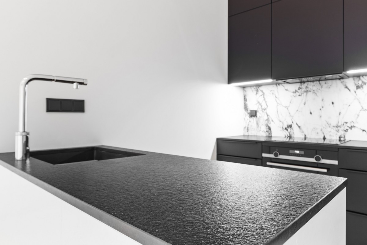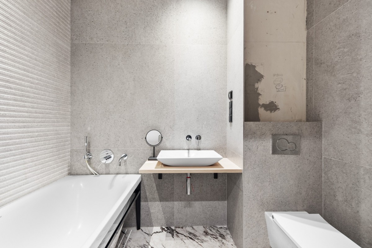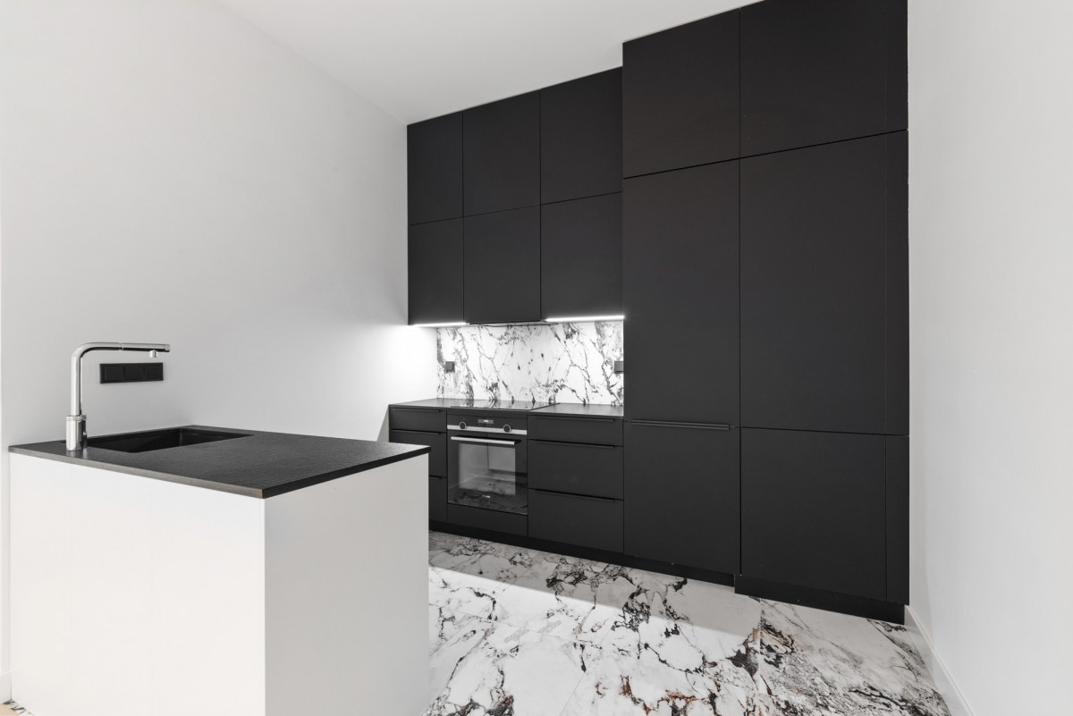 Wnętrze zostało wykończone z dbałością o każdy detal, z wykorzystaniem materiałów klasy premium. W całym mieszkaniu, wszędzie tam gdzie zastosowano płytki, wykonano ogrzewanie podłogowe Devi, a w łazience dodatkowo ogrzewanie ścienne tej samej marki. Na podłogach położono wysokiej jakości włoskie płytki marmurowe, natomiast płytki łazienkowe pochodzą z renomowanych hiszpańskich kolekcji. Uzupełnieniem całości jest szwajcarski parkiet drewniany Lares, włoskie, bezprzylgowe drzwi typu Invisible marki Barause oraz ekskluzywna niemiecka kuchnia Nolte z eleganckim marmurowym blatem.