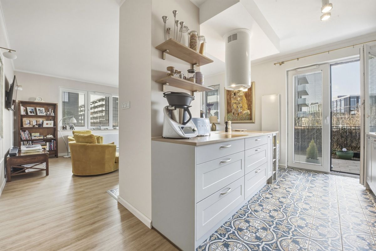 The focal point of the apartment is the bright living room with a kitchenette and dining area. Large windows lead directly to the private garden, which is a natural extension of the living area and creates a sense of space and proximity to greenery. The kitchen joinery was custom-made.