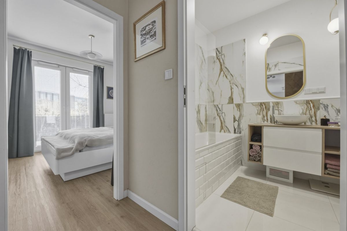 To mieszkanie sprawdzi się zarówno dla pary, jak i dla osób pracujących z domu, które cenią wygodny i przemyślany układ pomieszczeń.
