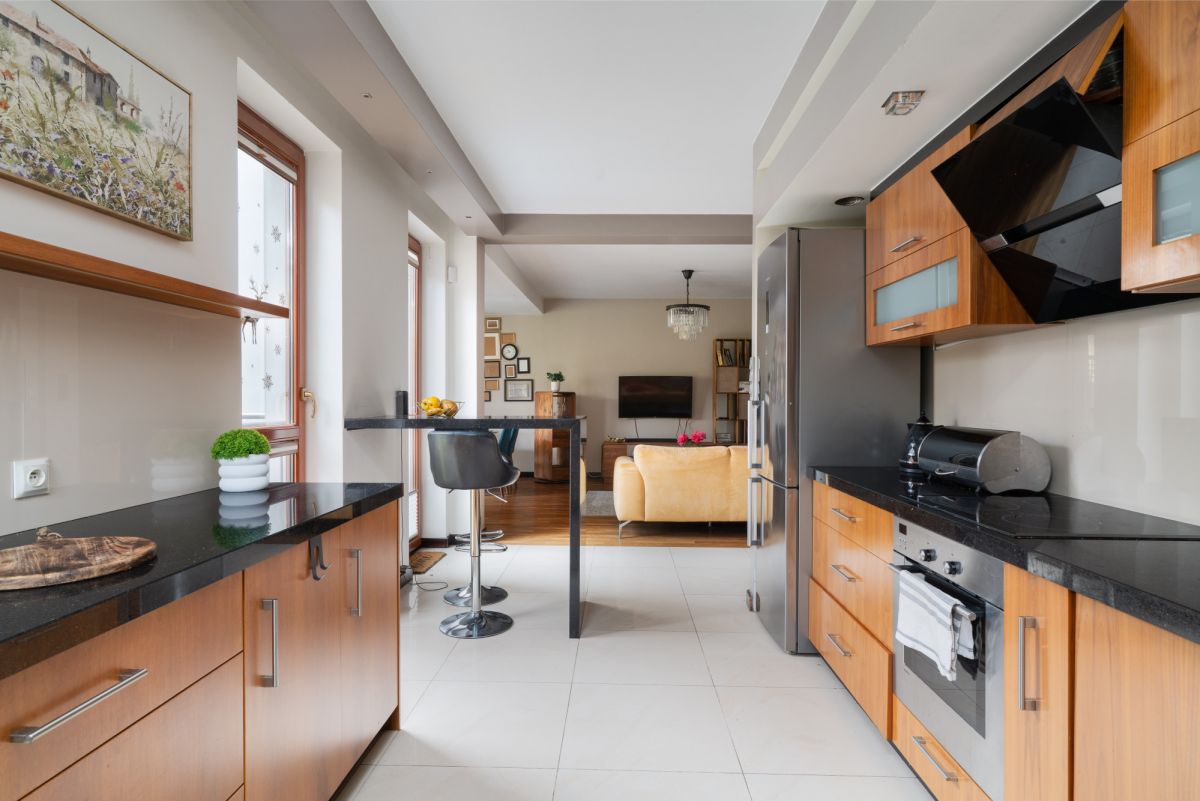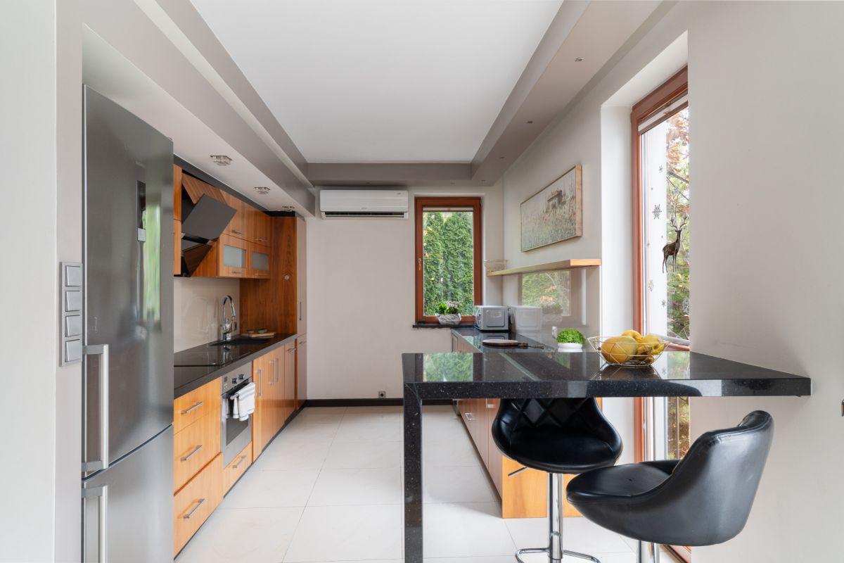 - Kuchnia z marmurowymi blatami i chłodziarką na napoje
