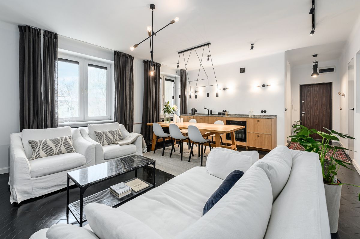 Mieszkanie po generalnym remoncie, wykończone w spójnym, nowoczesnym stylu z wyrazistym charakterem. Na podłogach dębowy parkiet pomalowany na czarno, który nadaje wnętrzu elegancji.