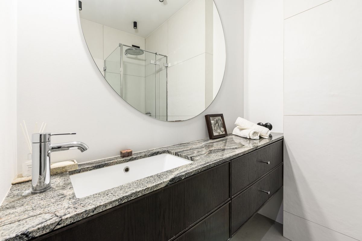 Zarówno kuchnia, jak i łazienka zostały wyposażone w kamienne blaty, które podkreślają wysoką jakość wykończenia oraz ponadczasowy charakter wnętrza.