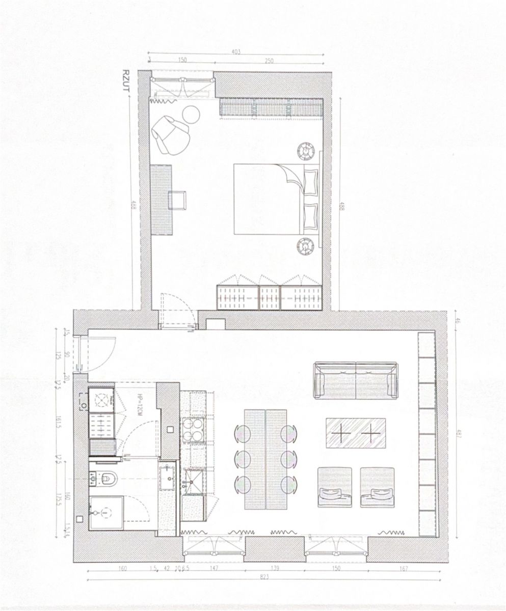 • pokój dzienny z aneksem kuchennym oraz stołem jadalnianym (z możliwością zastąpienia go wyspą kuchenną),