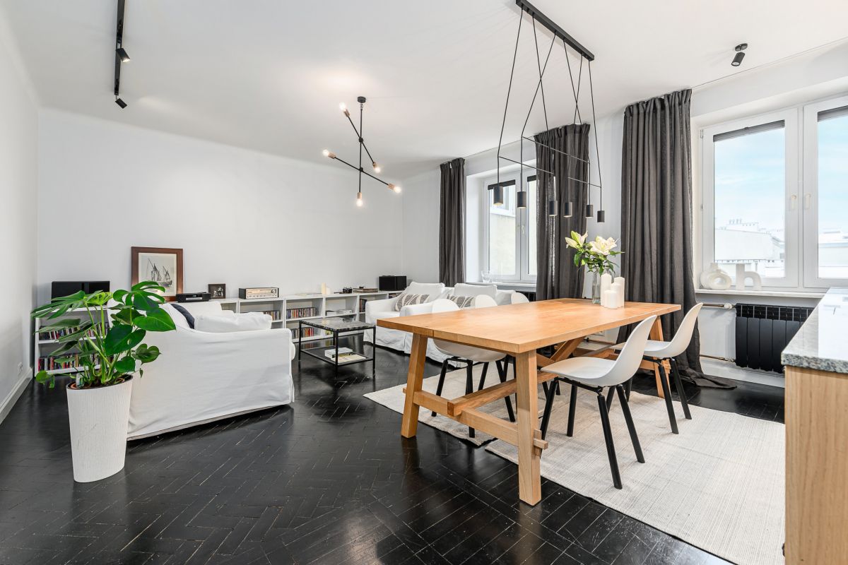 Mieszkanie po generalnym remoncie, wykończone w spójnym, nowoczesnym stylu z wyrazistym charakterem. Na podłogach dębowy parkiet pomalowany na czarno, który nadaje wnętrzu elegancji.