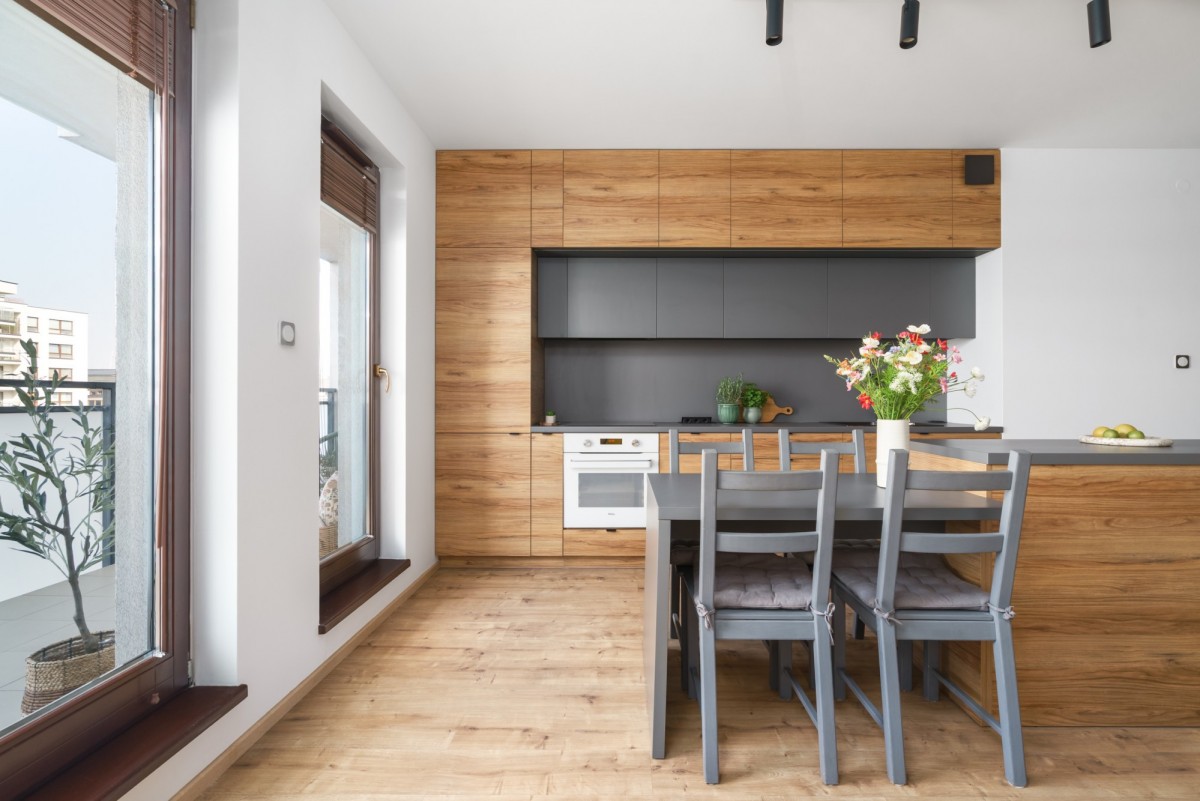 W nieruchomości zamontowano drewniane okna, a na podłogach znajdują się panele oraz gres.