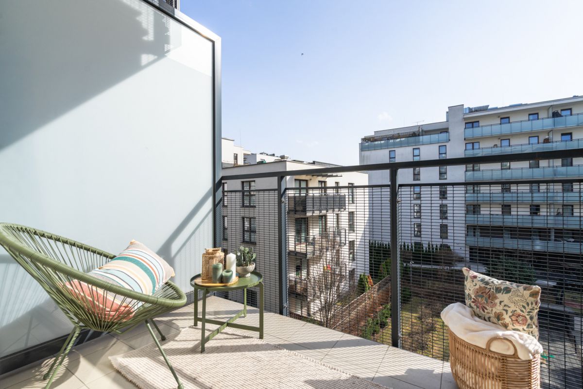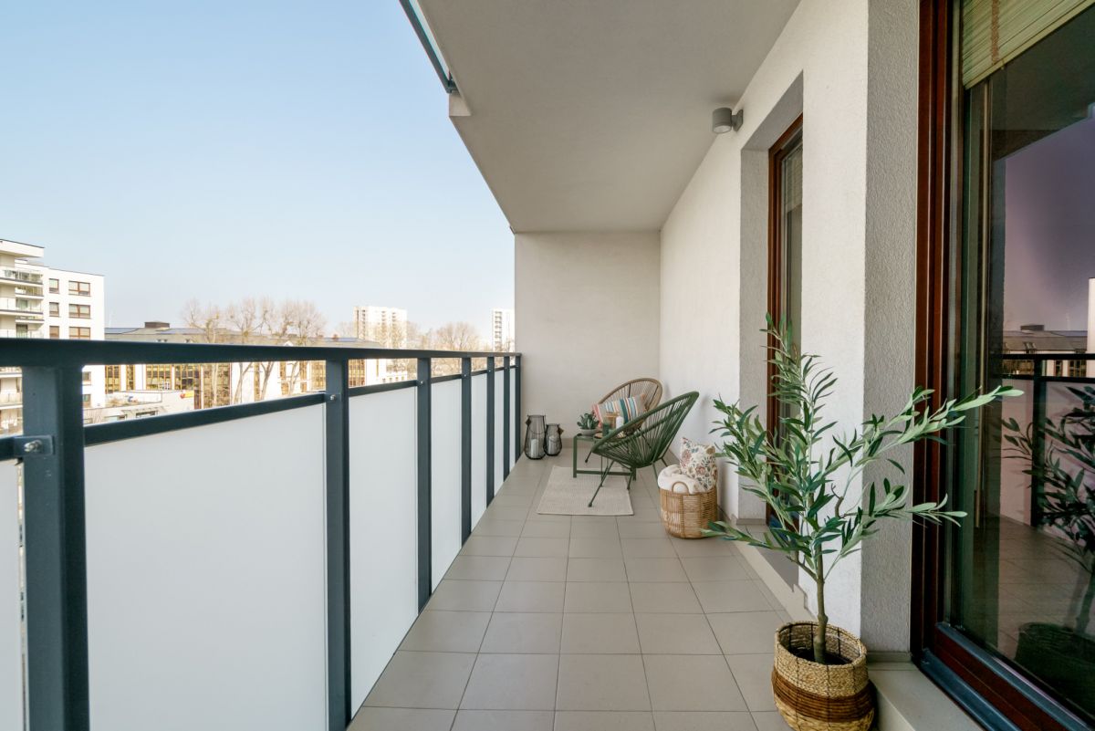 Większy balkon o powierzchni: 9,7 m² na który wychodzi się z salonu oraz drugi mniejszy o powierzchni 3,8 m² z wejściem w sypialni.