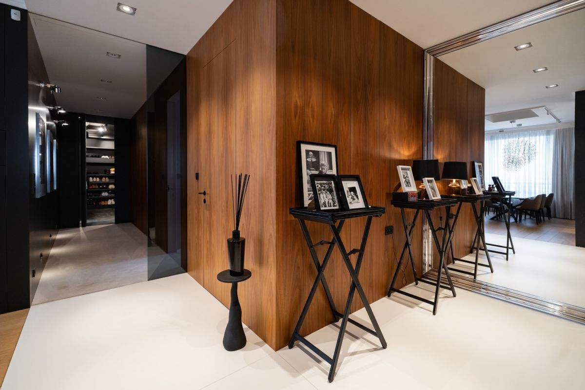 Całość wykończona z użyciem materiałów najwyższej jakości: naturalny dębowy parkiet, starannie dobrane przeszklenia, światowej klasy armatura i zabudowy stolarskie. Kolorystyka oparta na eleganckich szarościach, czerni i drewnie nadaje wnętrzu ponadczasowy charakter.