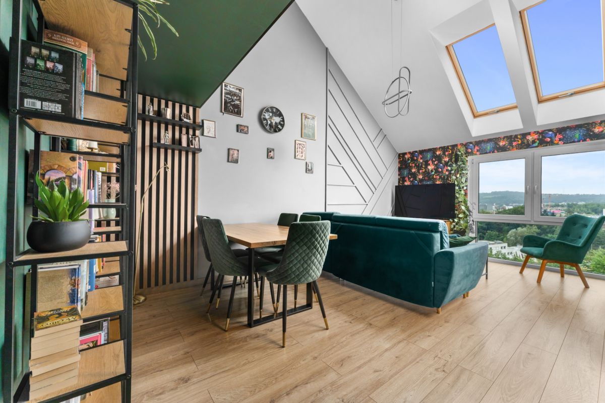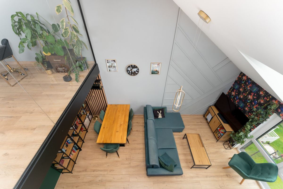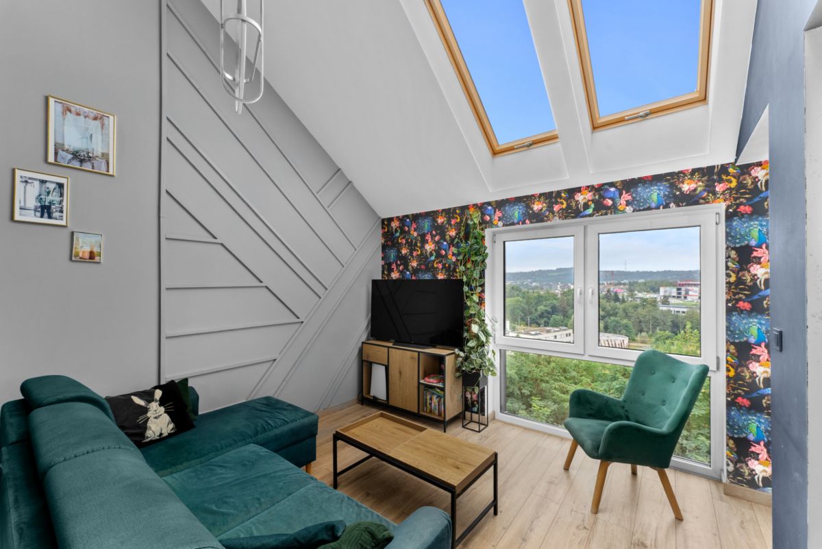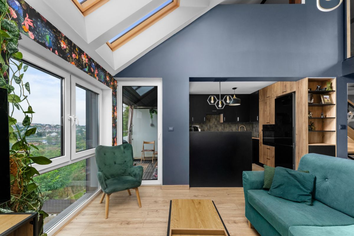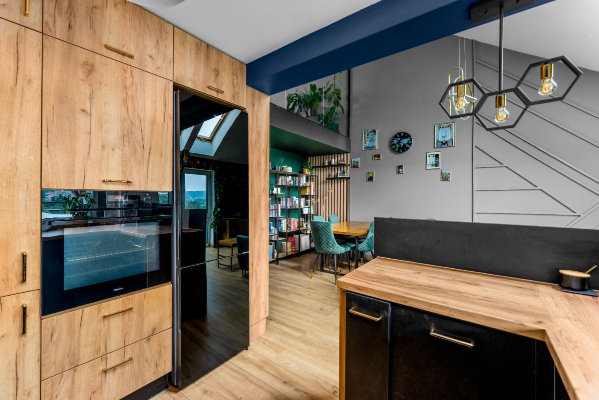 Wykończenie oraz wyposażenie lokalu wykonane jest w bardzo ciepłym, domowym stylu. Właścicielom szczególnie zależało na wyeksponowaniu wszystkich atutów nieruchomości w celu zapewnienia jak największego komfortu podczas użytkowania, przede wszystkim poprzez ekspozycję niesamowitego widoku na panoramę wielickich wzgórz i osiedli mieszkalnych. Również w tym celu wykonano szklaną ścianę z hartowanego szkła na antresoli, co nie tylko dodaje mieszkaniu uroku, ale też zapewnia dodatkowe źródło dziennego światła dla obu poziomów mieszkalnych.