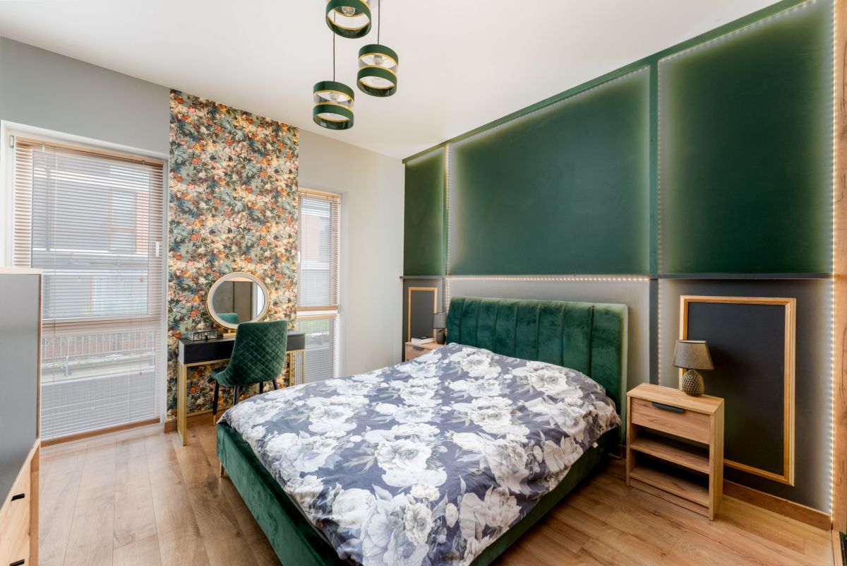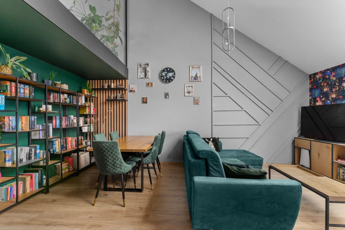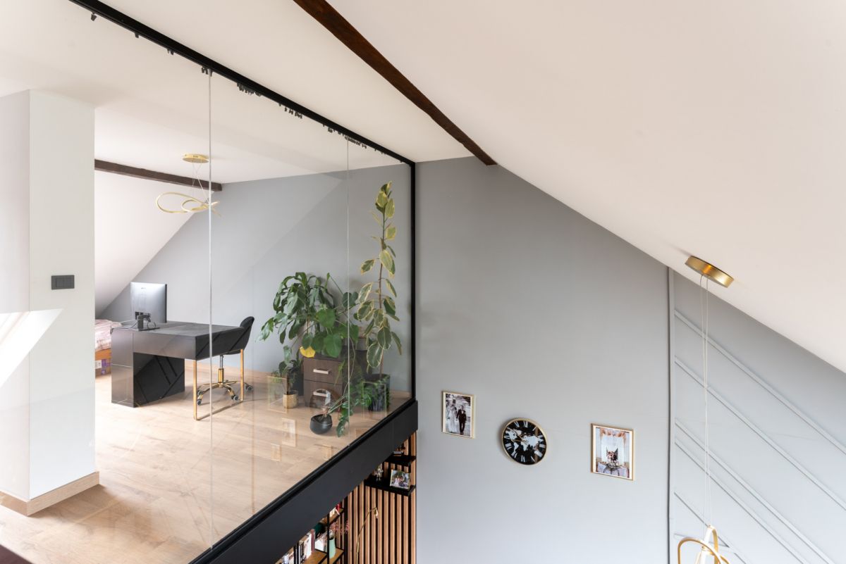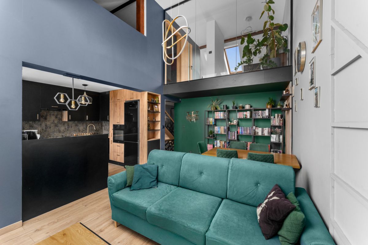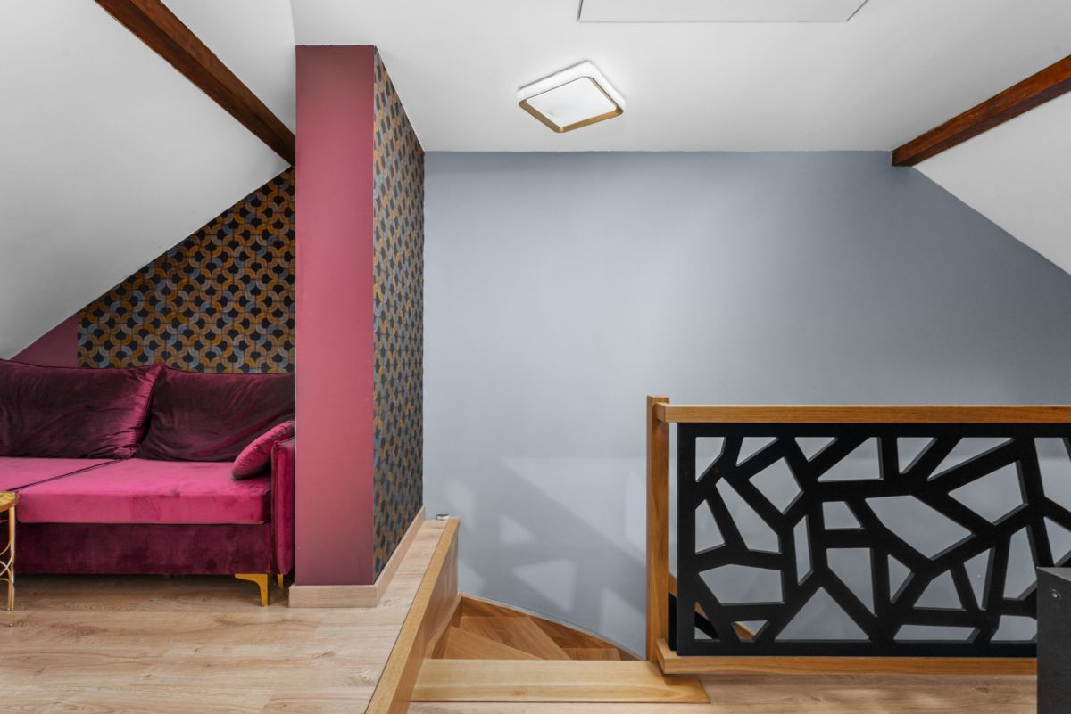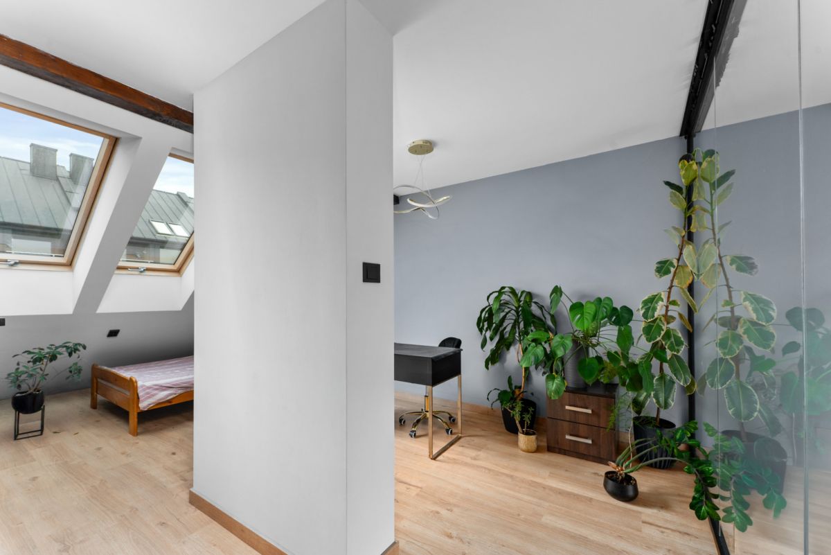 Wykończenie oraz wyposażenie lokalu wykonane jest w bardzo ciepłym, domowym stylu. Właścicielom szczególnie zależało na wyeksponowaniu wszystkich atutów nieruchomości w celu zapewnienia jak największego komfortu podczas użytkowania, przede wszystkim poprzez ekspozycję niesamowitego widoku na panoramę wielickich wzgórz i osiedli mieszkalnych. Również w tym celu wykonano szklaną ścianę z hartowanego szkła na antresoli, co nie tylko dodaje mieszkaniu uroku, ale też zapewnia dodatkowe źródło dziennego światła dla obu poziomów mieszkalnych.