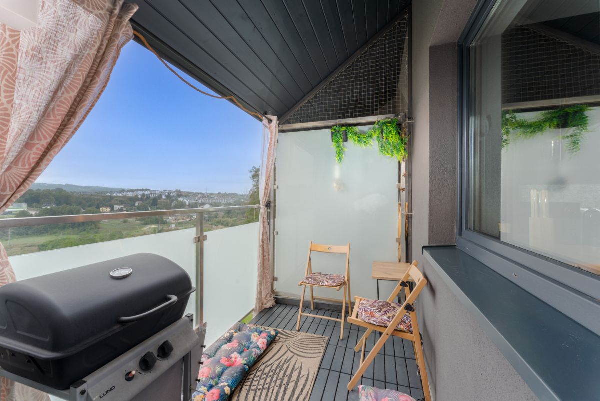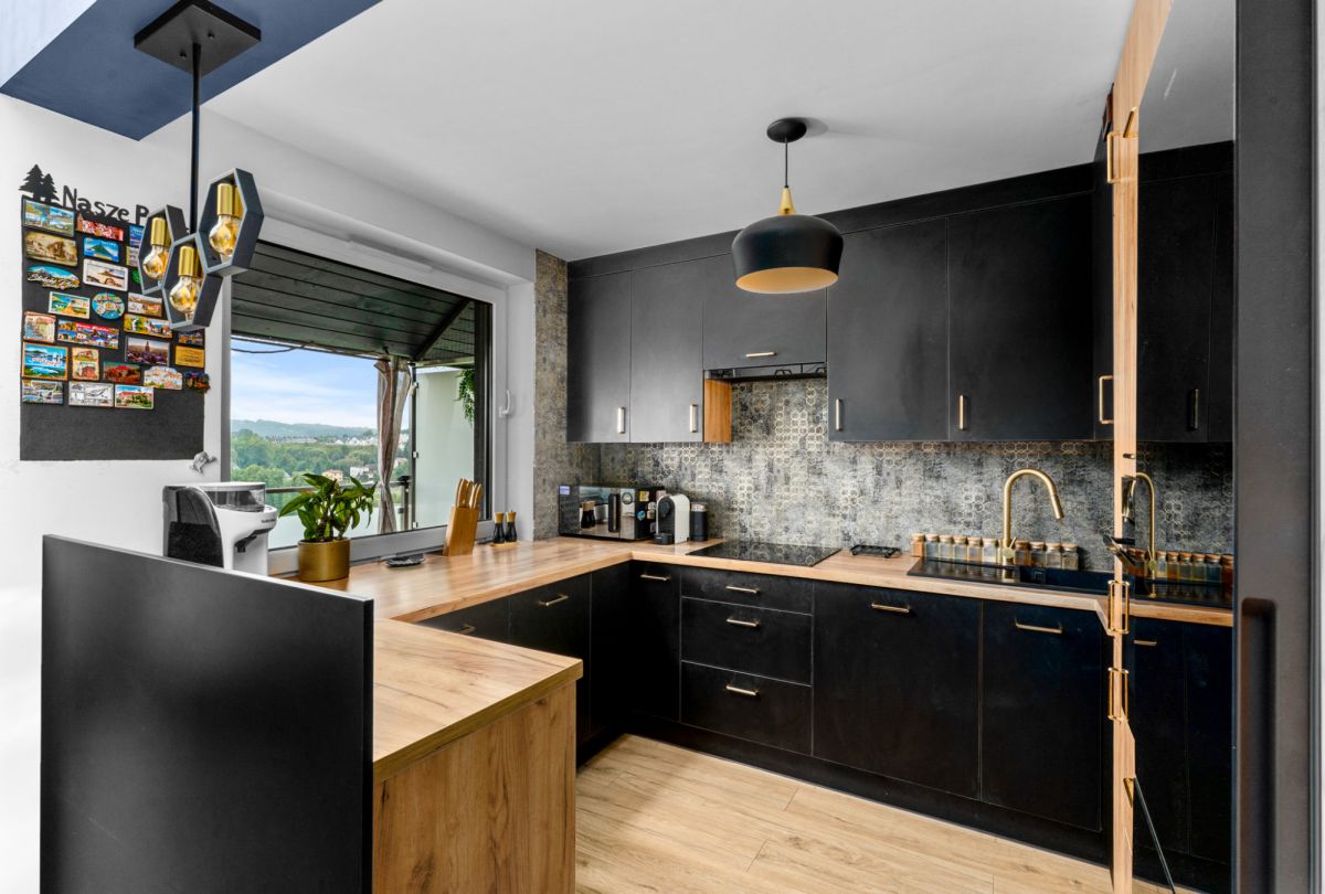 - Salon z otwartą, jasną kuchnią oraz wyjściem na balkon