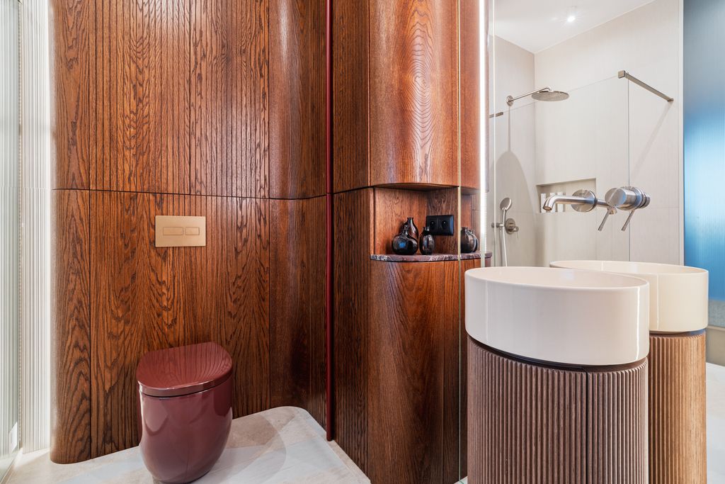 - Łazienka (ok. 4,5 m²): eleganckie płytki, prysznic walk-in, wysokiej jakości armatura.