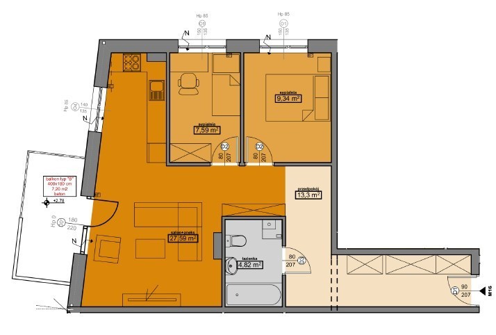 • Salon z aneksem kuchennym (27,59 m²) - przestronne centrum mieszkania, idealne do wspólnego spędzania czasu. Otwarta strefa dzienna z nowocześnie wyposażoną kuchnią.