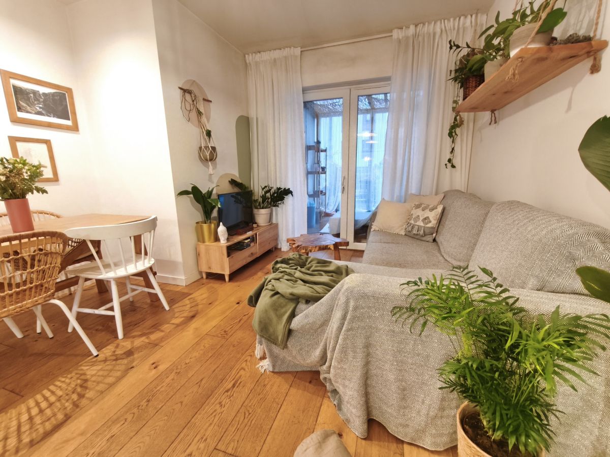 Z salonu wyjście na zadaszony i zagospodarowany taras oraz ogródek o łącznej powierzchni blisko 30 m² - idealna przestrzeń na poranną kawę, relaks lub spotkania z bliskimi.