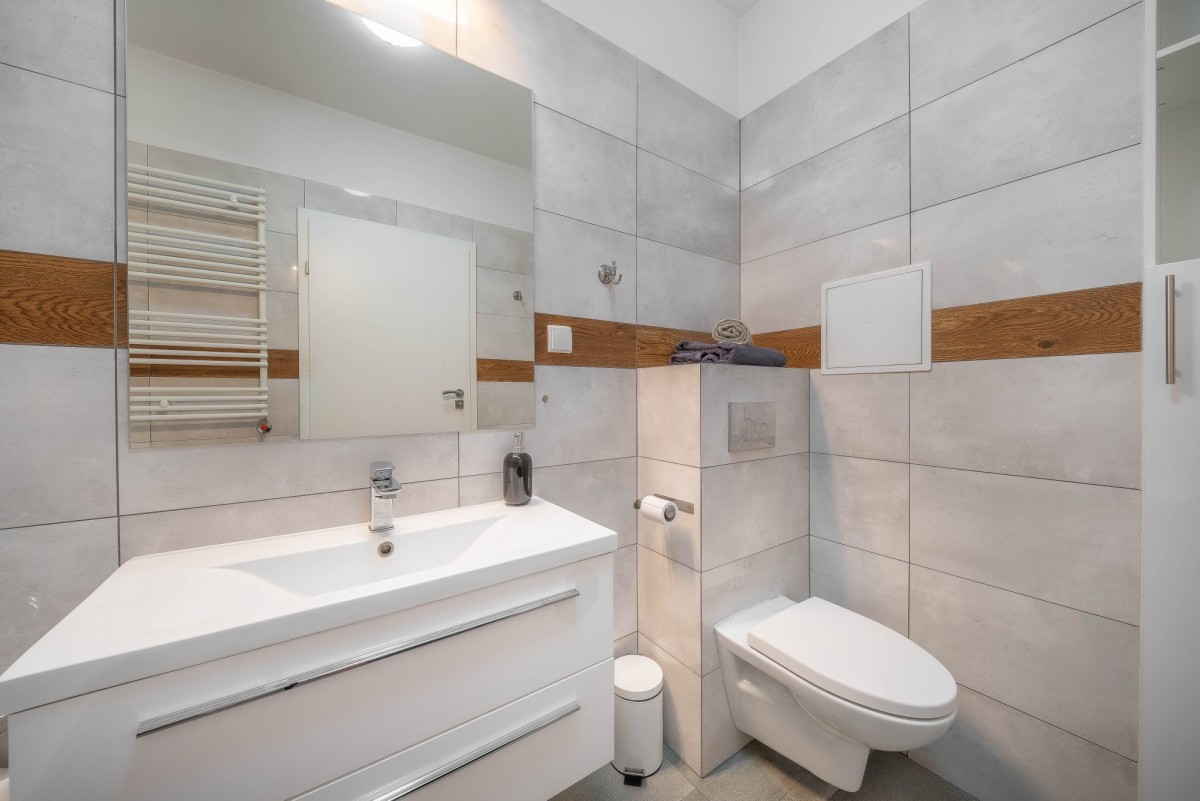 W cenie pozostają wszystkie sprzęty AGD: zmywarka, lodówka, piekarnik, mikrofalówka, płyta indukcyjna, pralka, suszarka oraz telewizor. Możesz wprowadzić się od razu. W szafach wnękowych zmieścisz bez problemu swoje rzeczy.