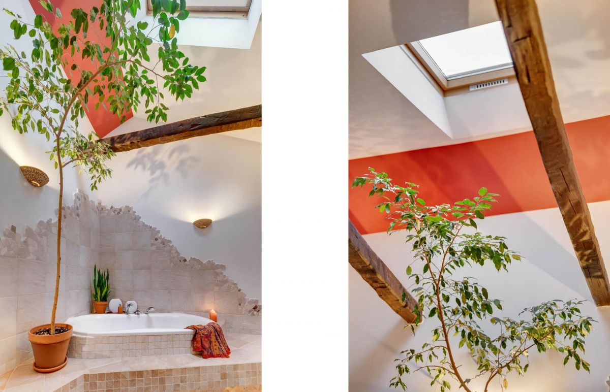 wyjątkowa łazienka typu domowe SPA z wysokimi sufitami, roślinnością, dużą wanną i oknem dachowym,