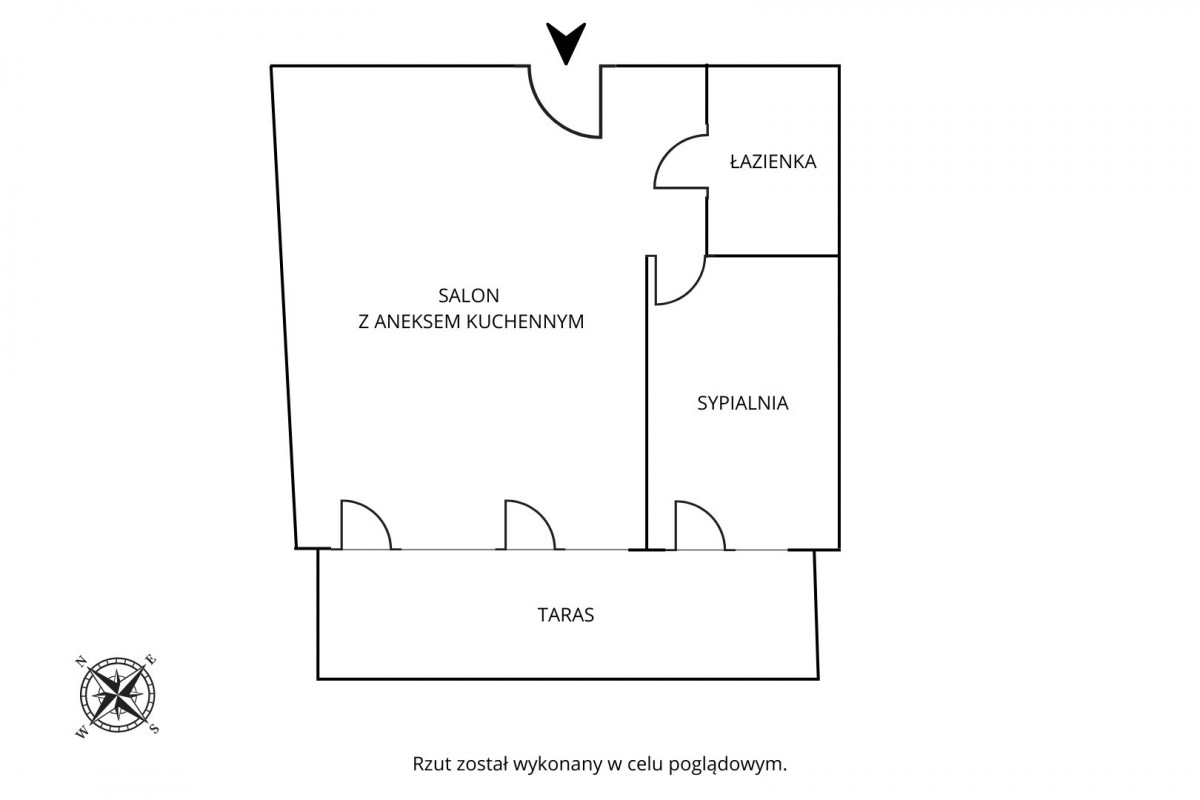 Przemyślany układ funkcjonalny: salon z aneksem kuchennym, sypialnia oraz elegancka łazienka.