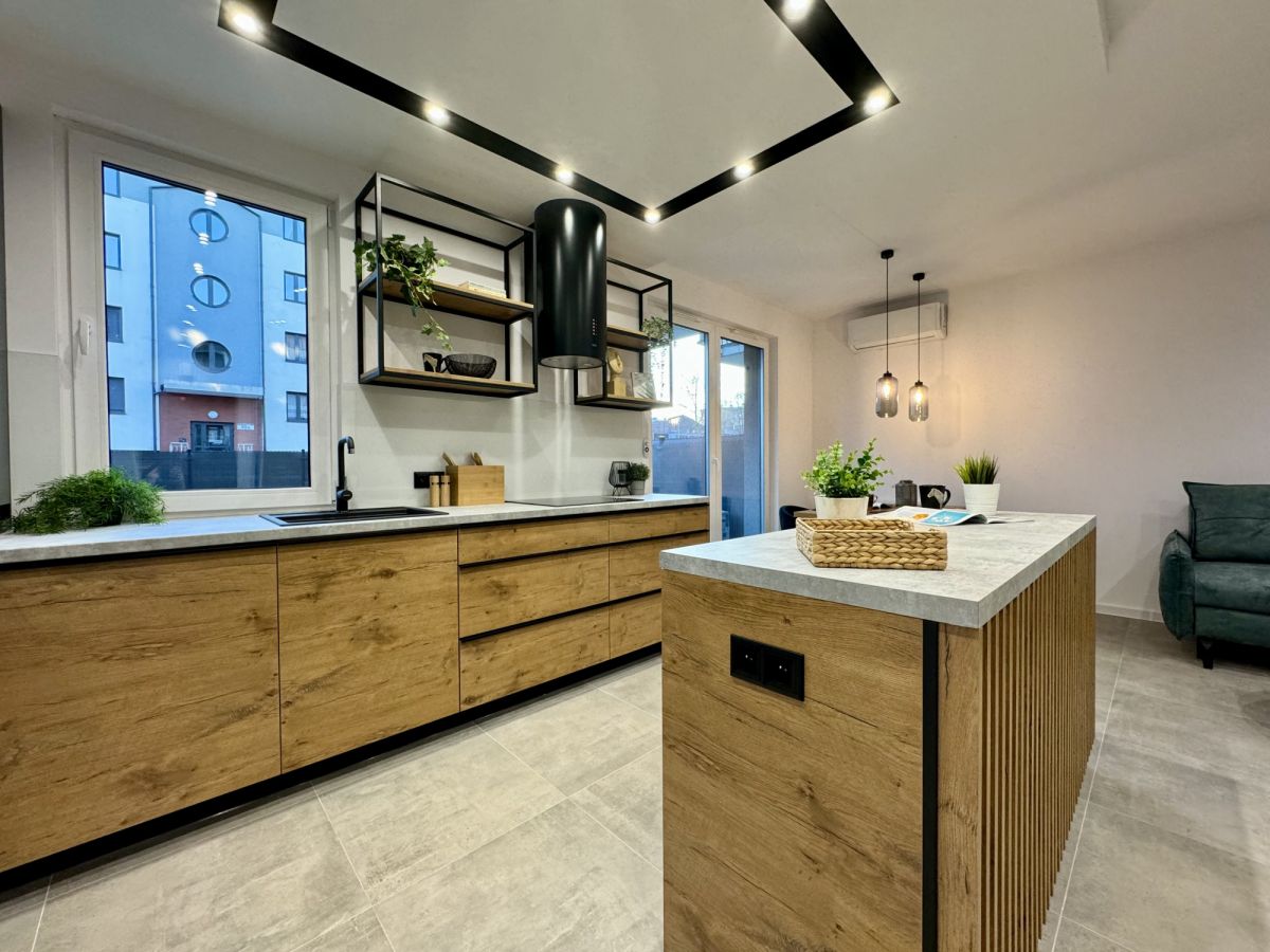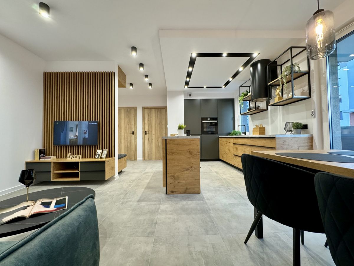 - Aneks kuchenny z wyspą wyposażony we wszystkie niezbędne sprzęty: szafki, zlew, lodówka, płyta grzewcza, piekarnik, zmywarka, okap.