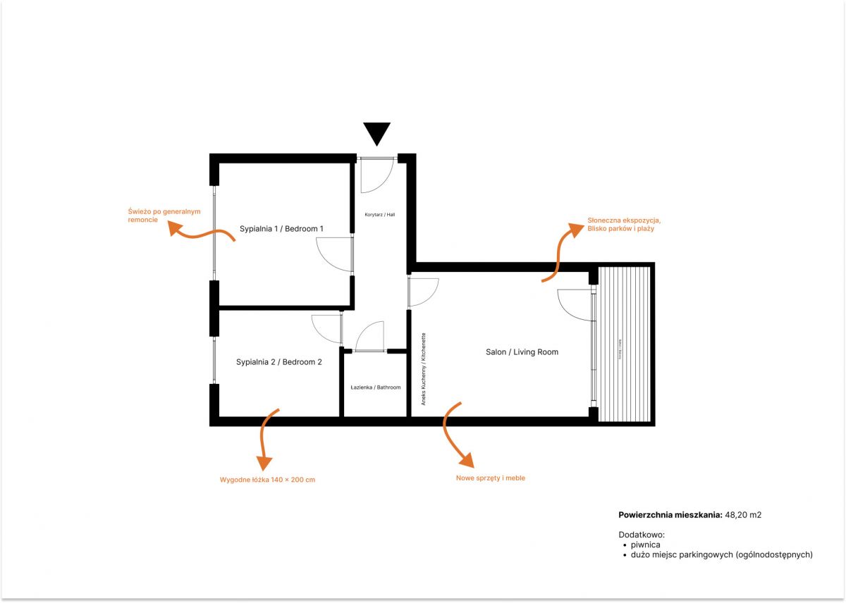 48,20 m² | Po generalnym remoncie | W pełni wyposażone | Niskie opłaty | 2 sypialnie | Salon z aneksem i narożną rozkładaną sofą | Duże i komfortowe łóżka 140 x 200 cm | SKM + tramwaj w odległości kilku kroków | Winda | Zabudowany balkon | Wszystko nowe | Świeżo wykończone | 15 min piechotą do plaży!