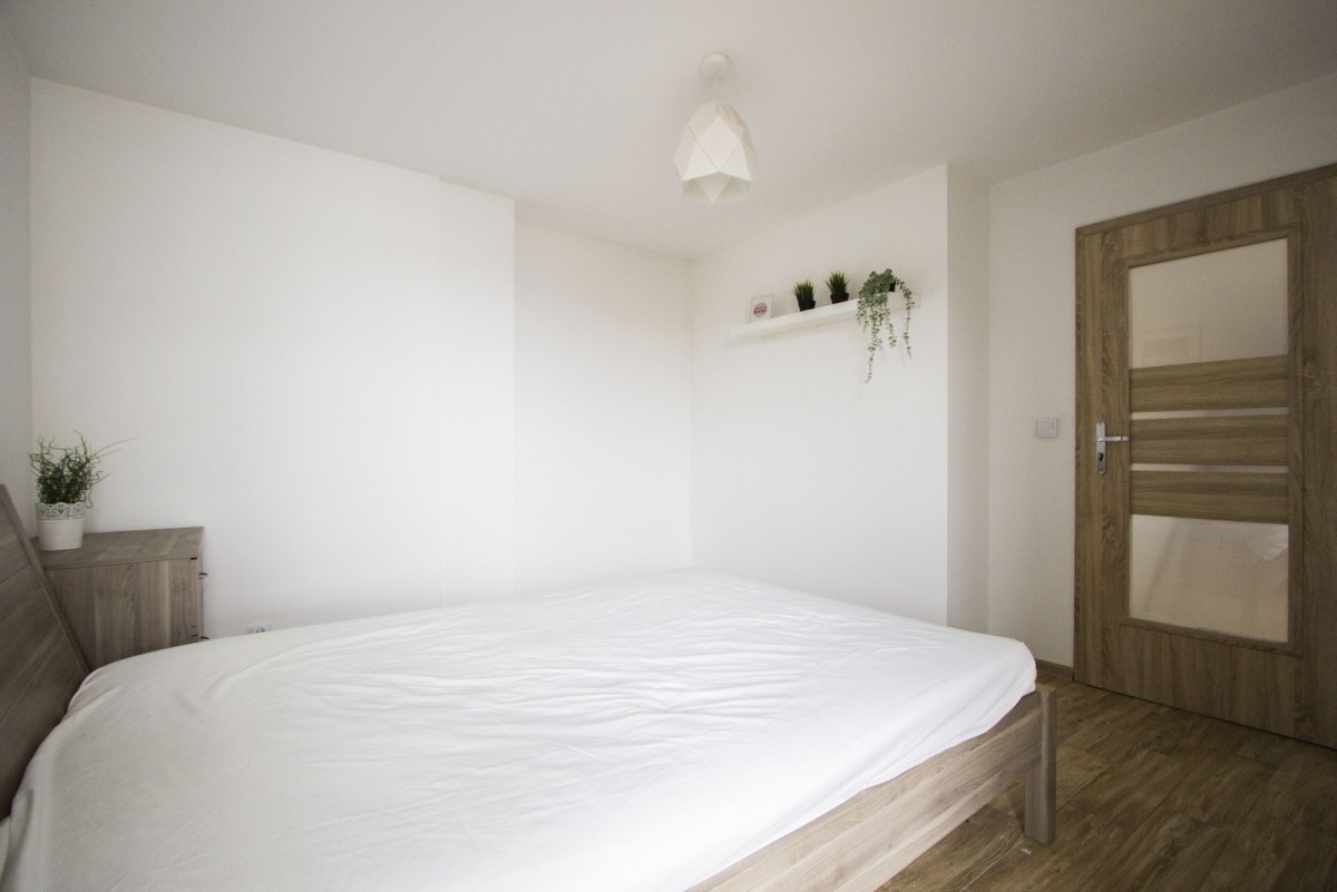 - Osobna, zamykana sypialnia: 2 osobowe, duże wygodne łóżko, szafki nocne, komoda.