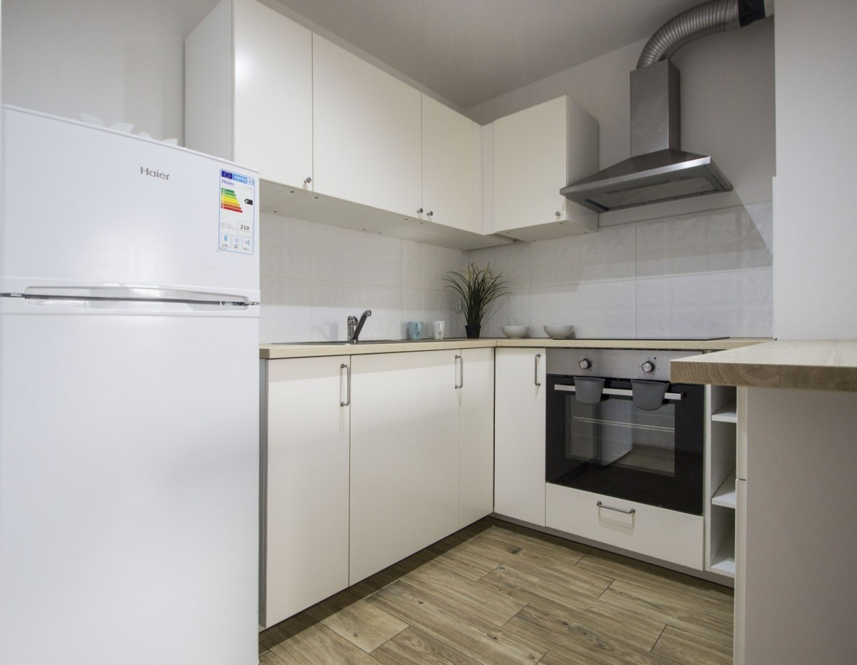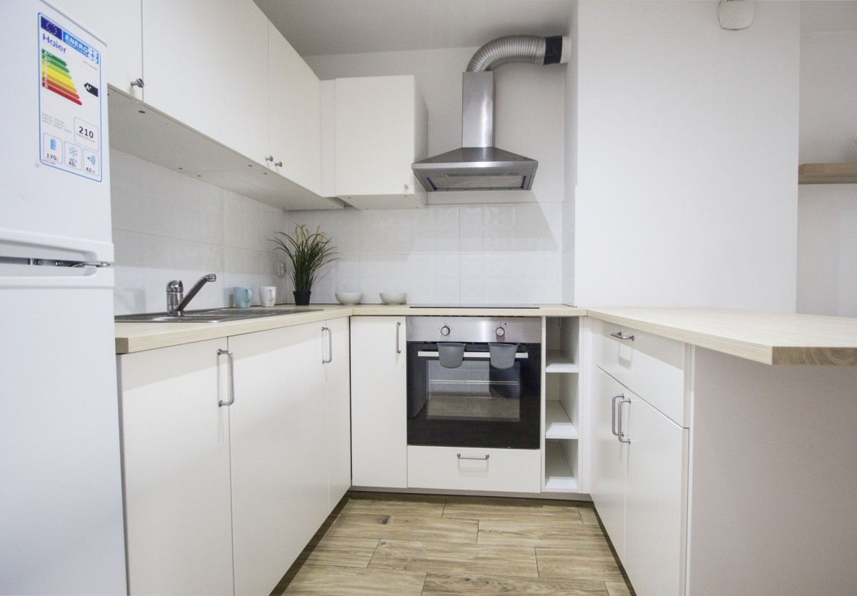 - Kuchnia wyposażona w wszystkie niezbędne sprzęty: szafki, zlew, lodówka, płyta grzewcza, piekarnik, okap.