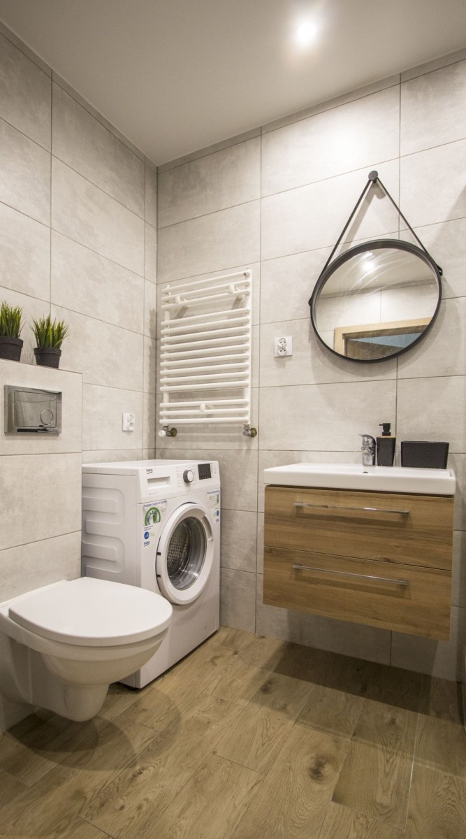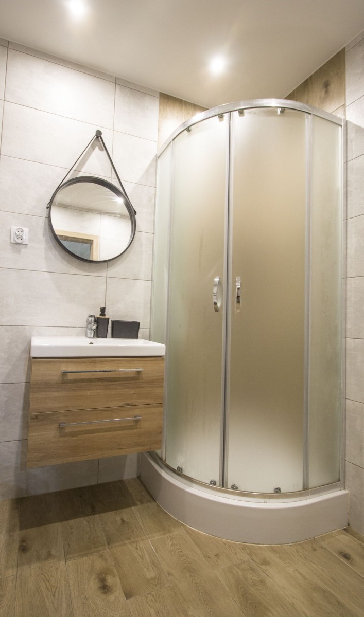 - Łazienka z WC: prysznic, umywalka z szafką, lustro, pralka,